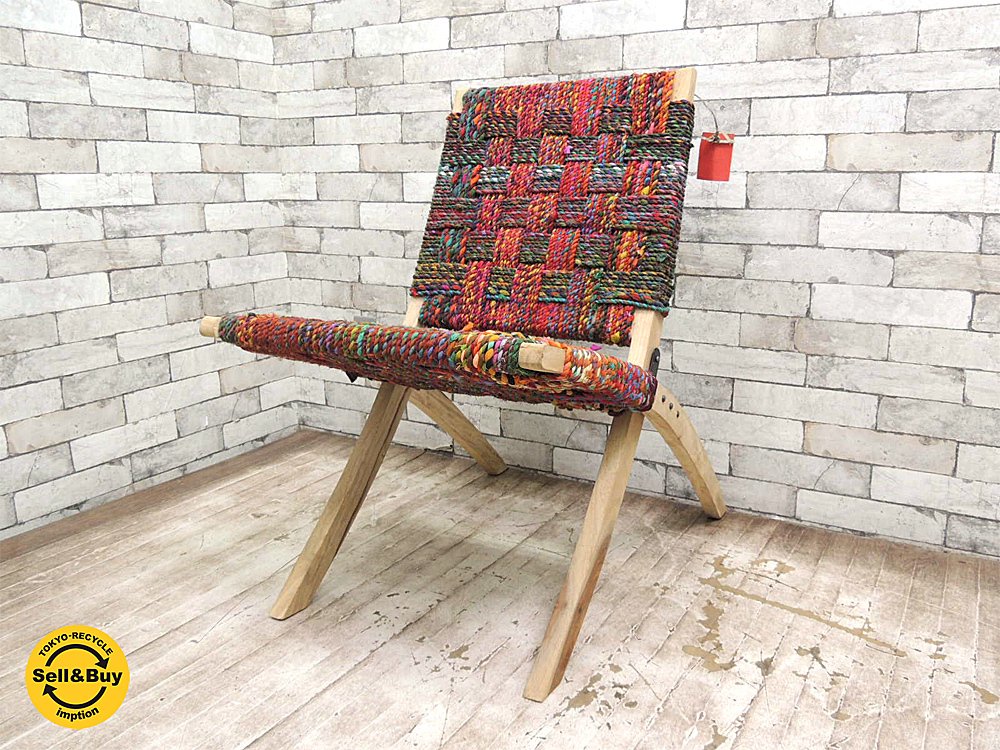 Salvage Crafts 裂き織りロープのフォールディングチェア 木製 折り畳み椅子 リサイクル生地 ラグ アジアン家具 インド ●
