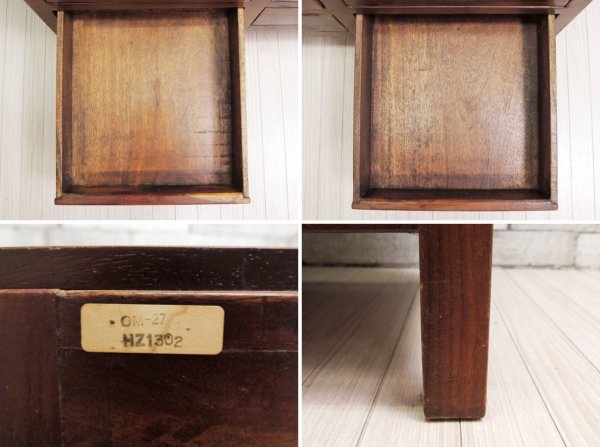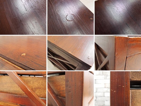 こちらはビンテージ品となります。使用・経年に伴いスレや線傷、打痕やペイントロス、汚れ、金具の錆びやくすみなどが多数見受けられます。また取っ手が緩んでいる箇所や硬い箇所、戻り切らない箇所などがございますが、抽斗の開閉には現状問題ございません。使用感はあるものの、風合いとしてお楽しみ頂けますと幸いです。