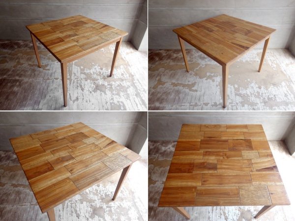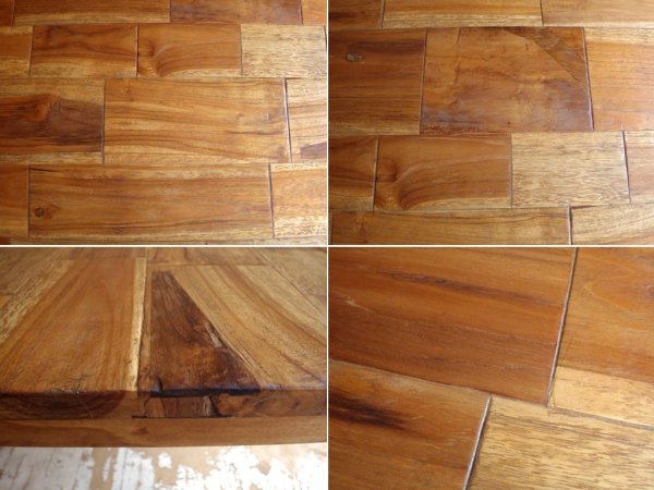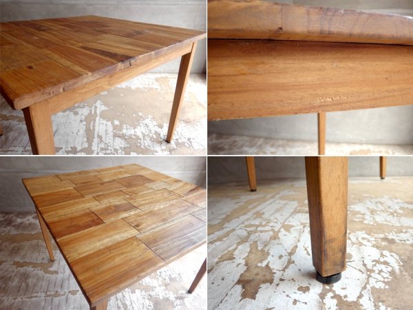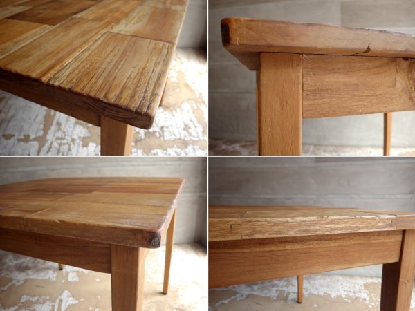 レンガのように組まれた天板が目を引く、表情豊かなチーク古材のテーブル。