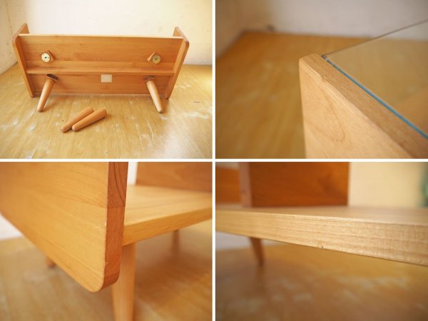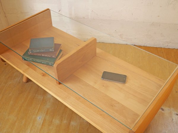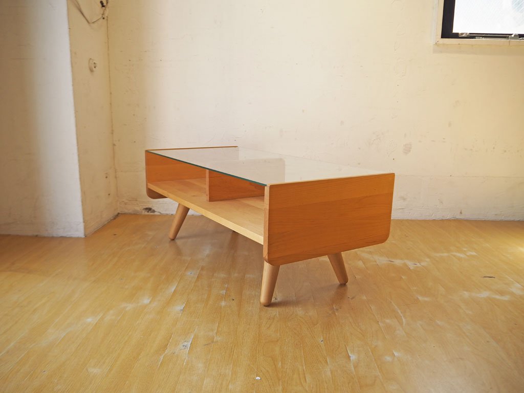 すっきりした印象を持つガラストップ、北欧意識したキュートな脚部、暖色系の滑らかな木肌を持つアルダー材の優しくて柔らかい雰囲気を感じられるコーヒーテーブルです。