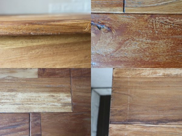コチラのお品物は古材無垢材を使用したものとなり、製造時からの傷やスレ、打痕や欠け、色ムラや凹凸などがございます。また天板に一部白い線の様な傷が一箇所ありますが、機能に問題あるような大きな損傷はなく、古材の雰囲気を充分に楽しめる雰囲気のあるコンディションかと思われます。