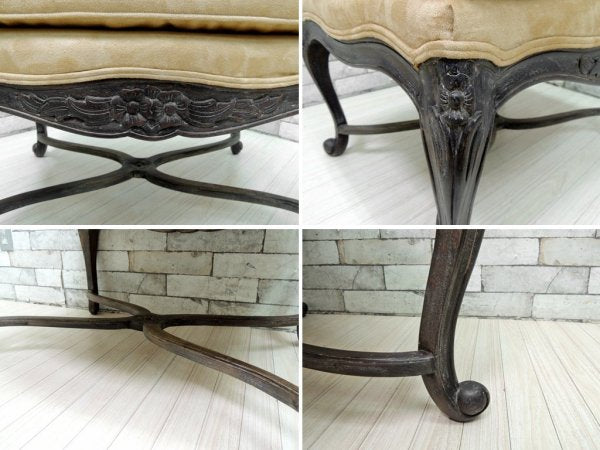 スウェード調のファブリックにシャビーなペイントのマホガニー材フレームの組み合わせは、まるで本物のビンテージ家具のよう。