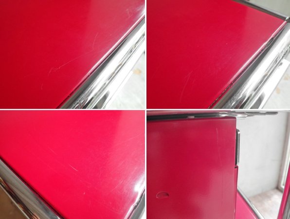 全体的にスレ傷、クロームメッキの荒れ、取りきれない汚れなど使用感が各所に見受けられます。他キャスターカバーにチップ、ペイント浮きなどございますが大きく目立つ物ではなく、これからもアイテムの良さを感じてお使い頂けるUSED品として概ね良好なコンディションをたもっております。