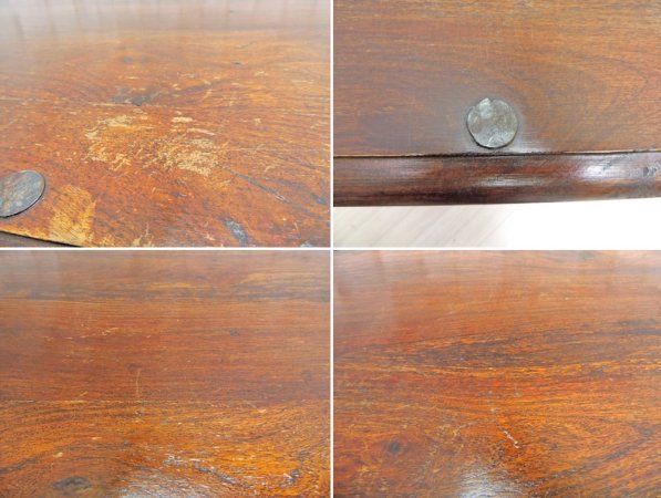 使用に伴い天板に細かい傷、脚に打痕がございます。その他全体的に色ムラや微細なヒビ割れ等が見受けられますが、古い木材特有の表情としてお楽しみ頂けるかと思います。その他グラつきや目立った割れ等の使用上問題となる様な大きなダメージは見受けられず、概ね良好なコンディションを保っております。
