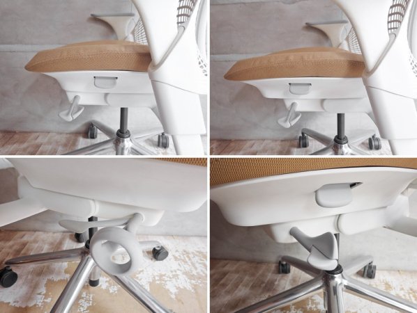 アーム高を調節出来るアジャスタブルアームやリクライニングの強弱、座面昇降や前傾チルトなど、エルゴノミクス(人間工学)に基づいて考え抜かれた大変機能的なデスクチェアとなっております。