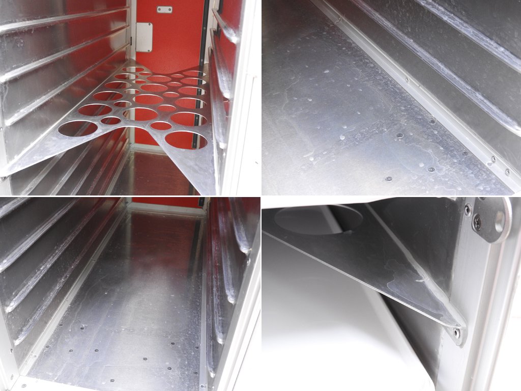 こちらは機内食の運搬でご存知のミールカート。両面から配膳が可能なフルサイズ。フレームの強度は勿論、業務用として製造されたタフなキャスターは、赤と緑のフットスイッチで固定と解除が可能です。