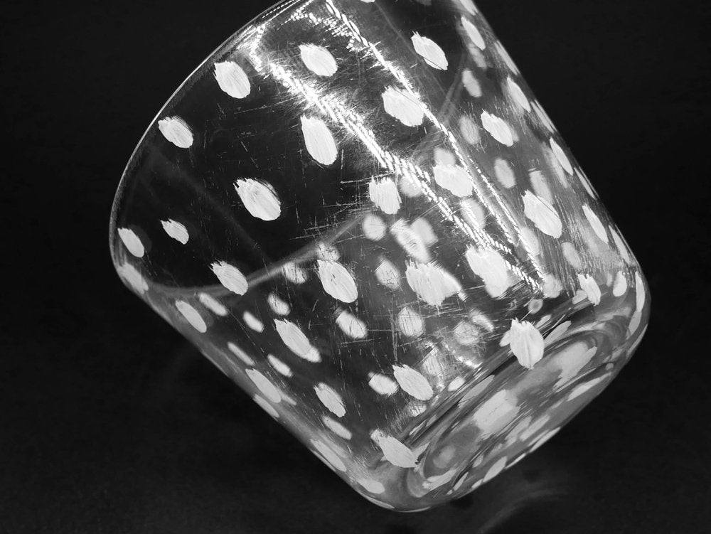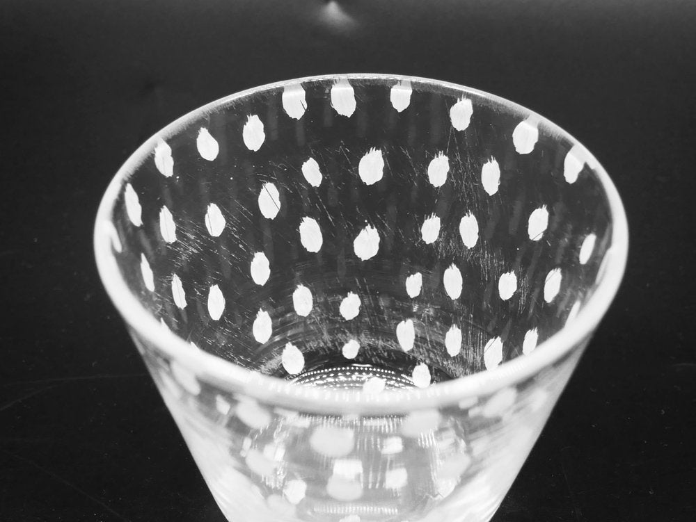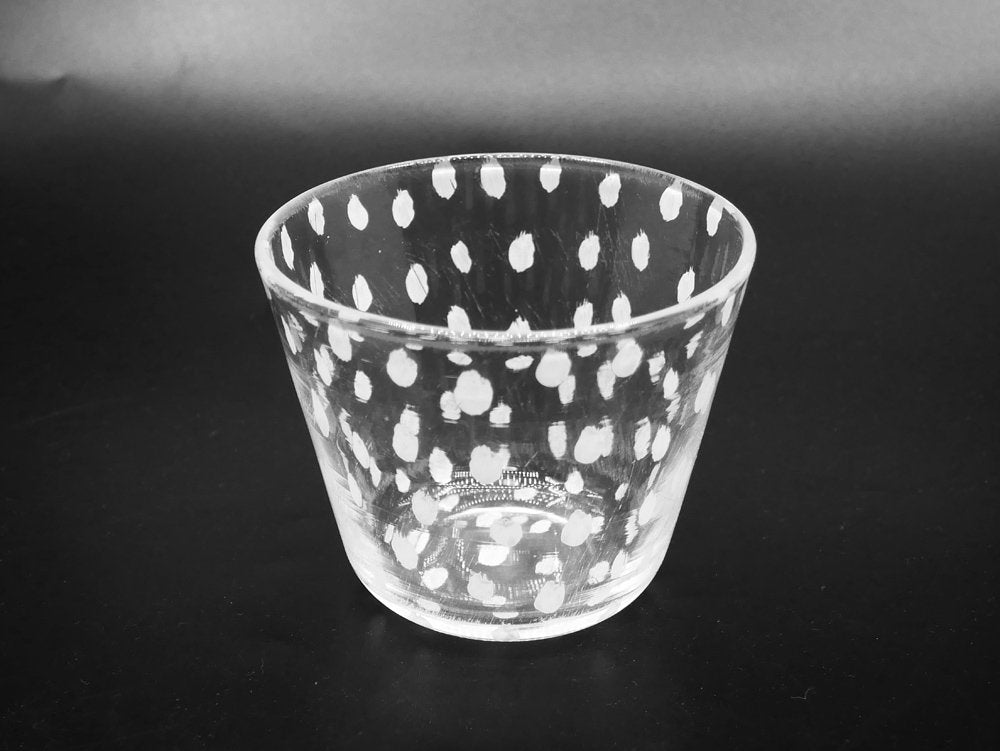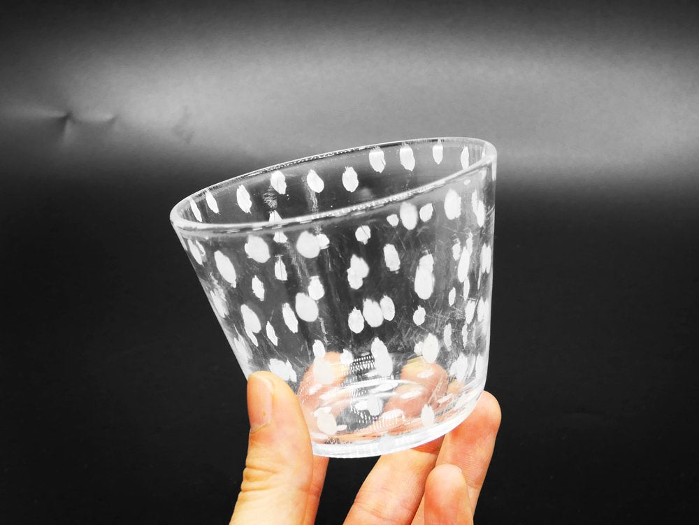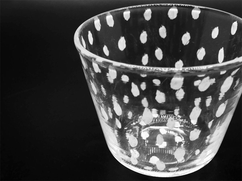 テンテンの名の通り、ハンドペイントのドットが点々と描かれたガラスの猪口。サンドペーパーで表面に擦りきずが入っている作風も特徴です。