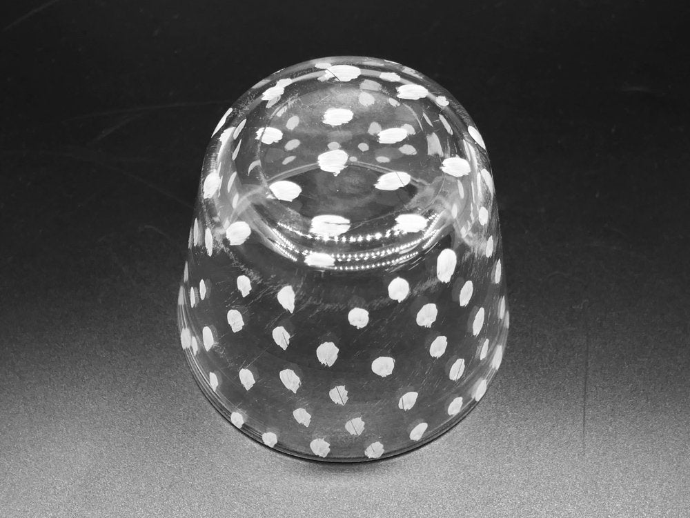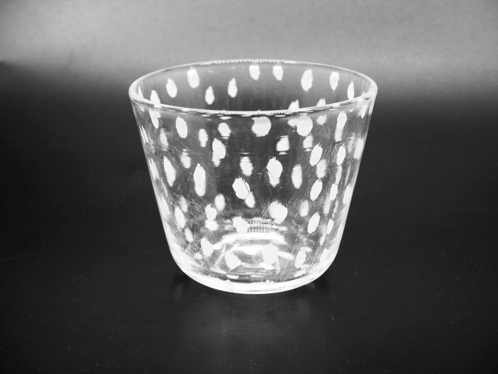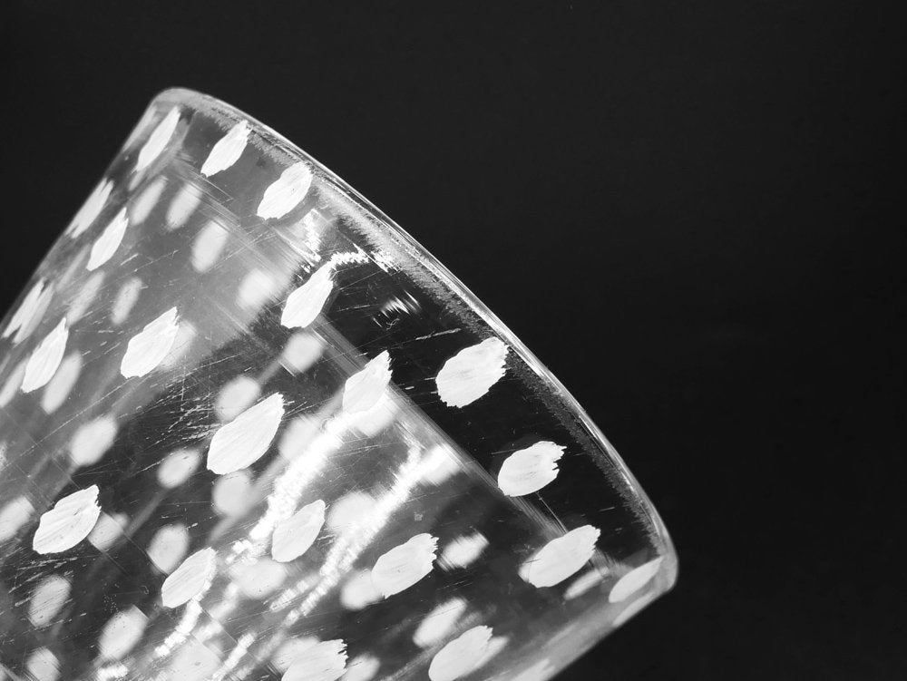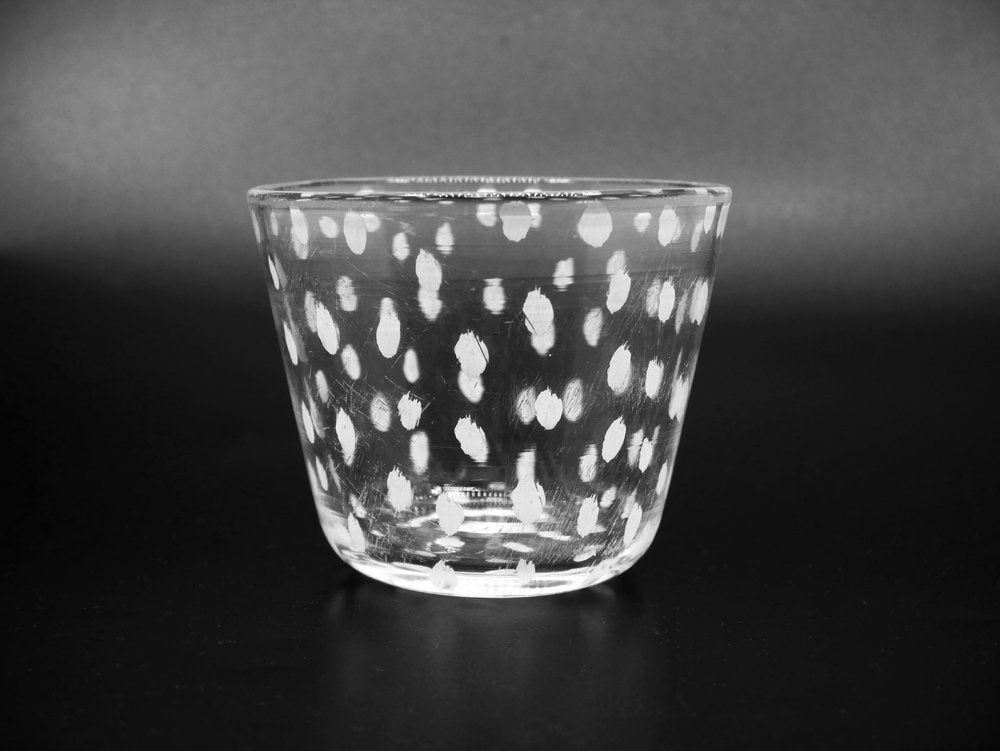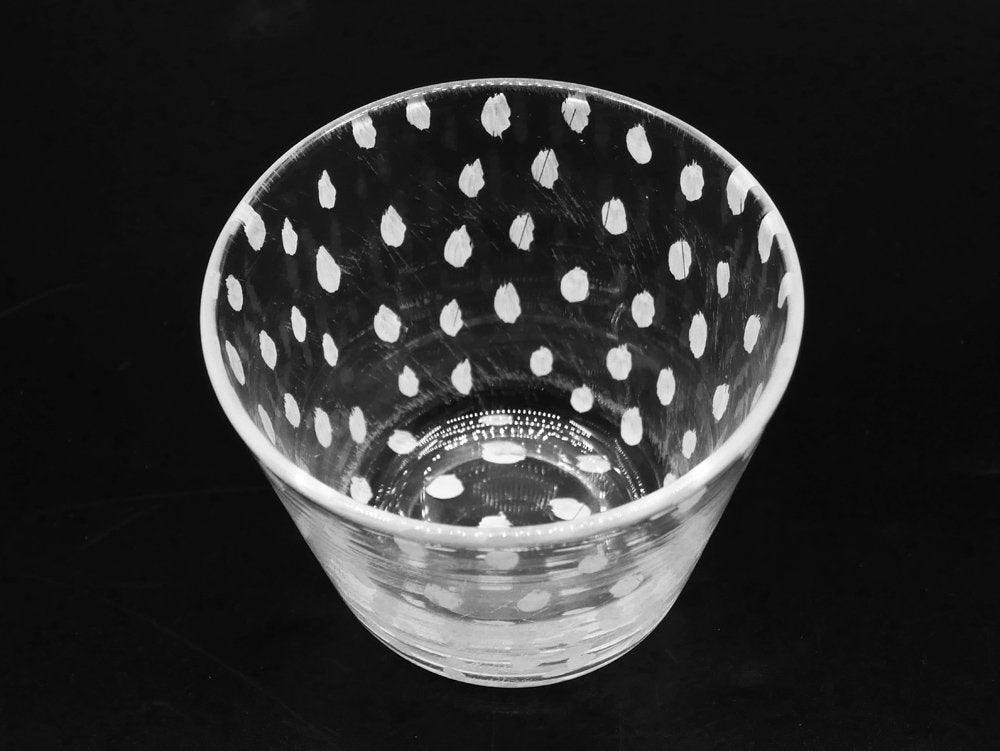 テンテンの名の通り、ハンドペイントのドットが点々と描かれたガラスの猪口。サンドペーパーで表面に擦りきずが入っている作風も特徴です。