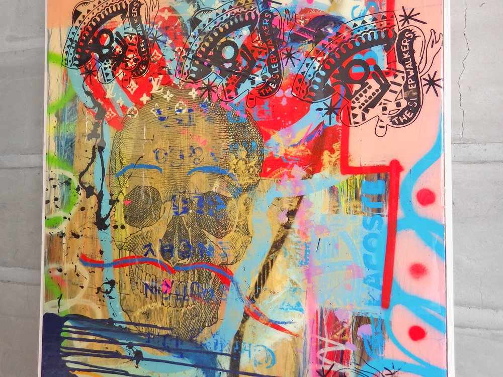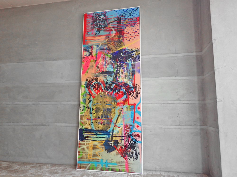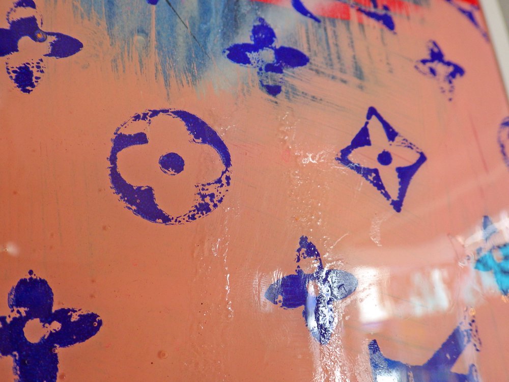 その作風はシルクスクリーン画像をサイケデリックに彩ったものや、シャネルやルイヴィトンなどのロゴマークのプリントに大胆にペイントをしたものなど、多岐にわたります。