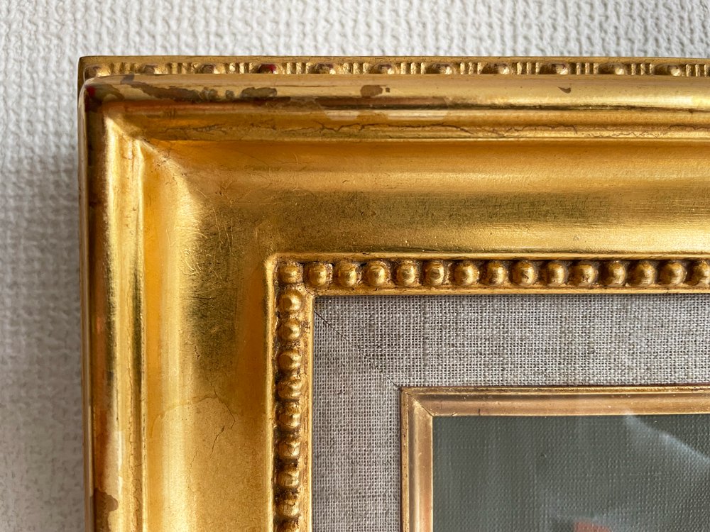 フレームに塗装の剥がれが複数箇所、マット部分に染み、背面の金具に錆びがございますが作品自体に著しいダメージはございません。