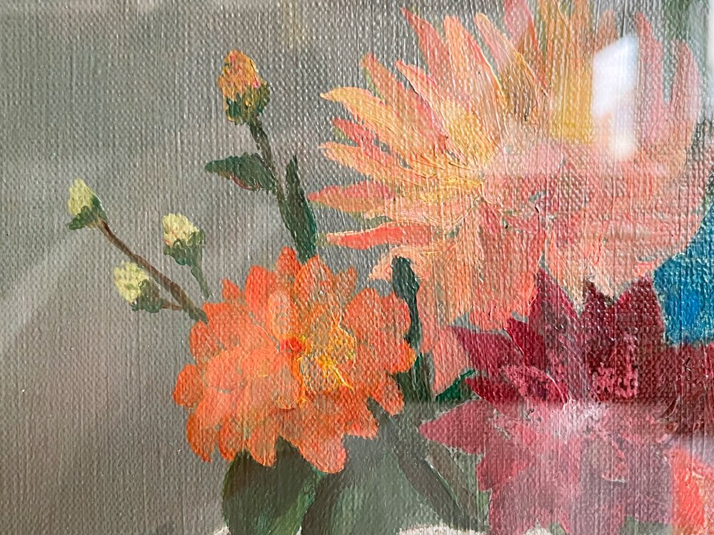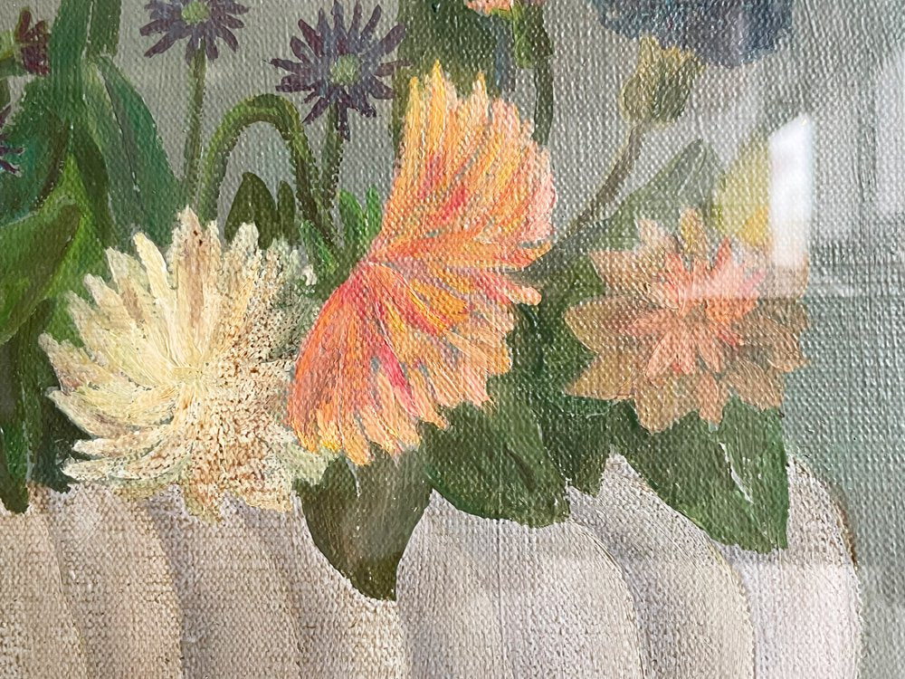 こちらは「白いつぼの花」。グレーがかったグリーンの背景に、ハンドドローイングのタッチを残した花瓶と花の表現。全体としてダークトーンの落ち着いた雰囲気です。F5サイズと日本の手狭な空間にも取り入れ易い大きさなので、コレクションとしては勿論、お部屋のインテリアとしてもオススメです!