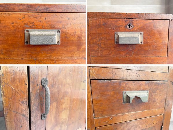 コチラのお品物はビンテージ品となります。使用・経年に伴う傷やスレ、打痕や色ムラ、鋲穴やヒビ、割れや欠け、落ち切らない汚れなどが全体的に見受けられます。。また、向かって右側2段目の把手に割れによる欠けがございますが、抽斗の開閉には問題ございません。その他、ご使用に問題のある箇所などもございません。ビンテージ品ならではの風合いをお楽しみ頂けるコンディションを保っております。