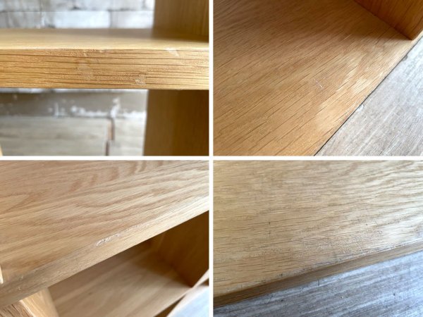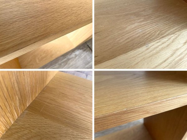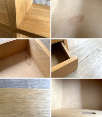 使用に伴い、棚板には僅かな線傷や打痕、クリーニングしきれない汚れが散見され、一部突板のチップや削れが見受けられます。また、抽斗には擦れ傷や線傷が、内部にはクリーニング染みが一部確認できます。しかしながらいずれも美観を著しく損ねるものではなく、これからもお使い頂ける状態となっております。