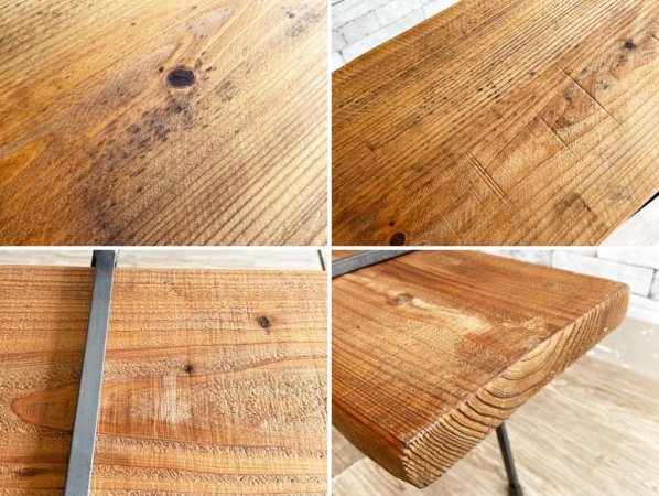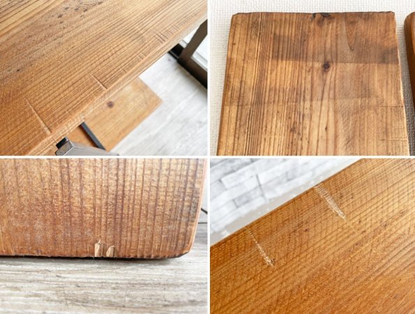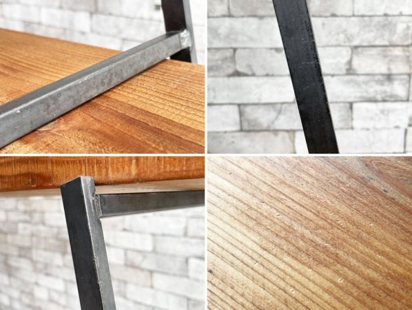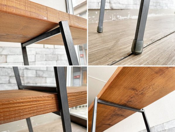 使用に伴い棚板に傷や汚れ、アイアン脚に金属特有のくすみや錆びなどが確認できますが、ラフな仕上がりが魅力のお品物ですので、風合いとしてお楽しみ頂けそうです。棚板には無垢材特有の反りが確認できますが実用に支障は無く、その他使用上問題となるダメージも見受けられない中古品としては概ね良好なコンディションを保っております。