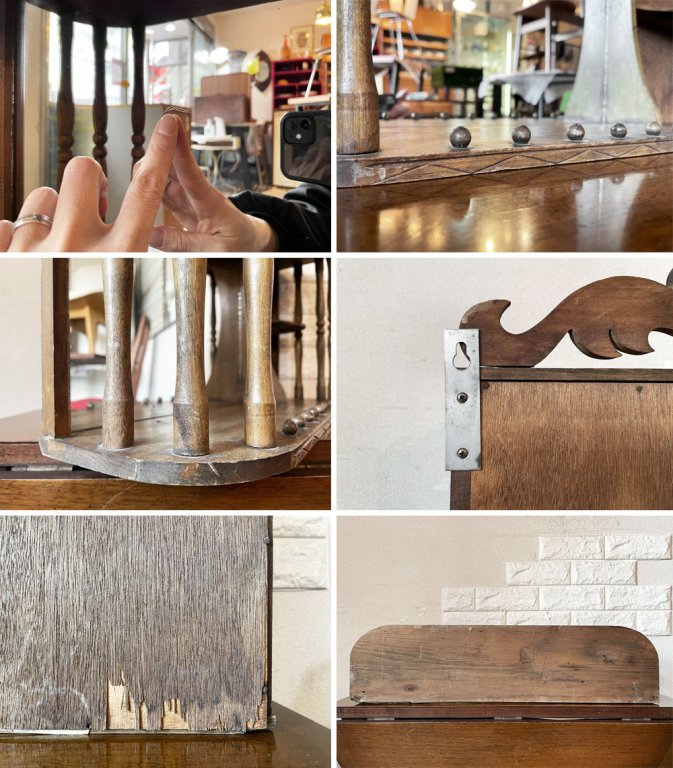 その他、傷や縁の削れ、鏡面のくすみ、背板の剥がれ、ファブリック部分のシミ汚れなど、経年なりのダメージが見受けられますので詳細画像をご確認くださいませ。
