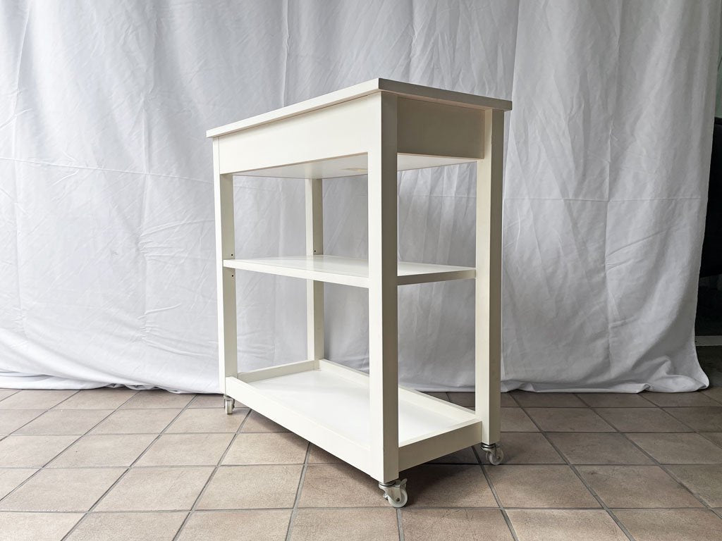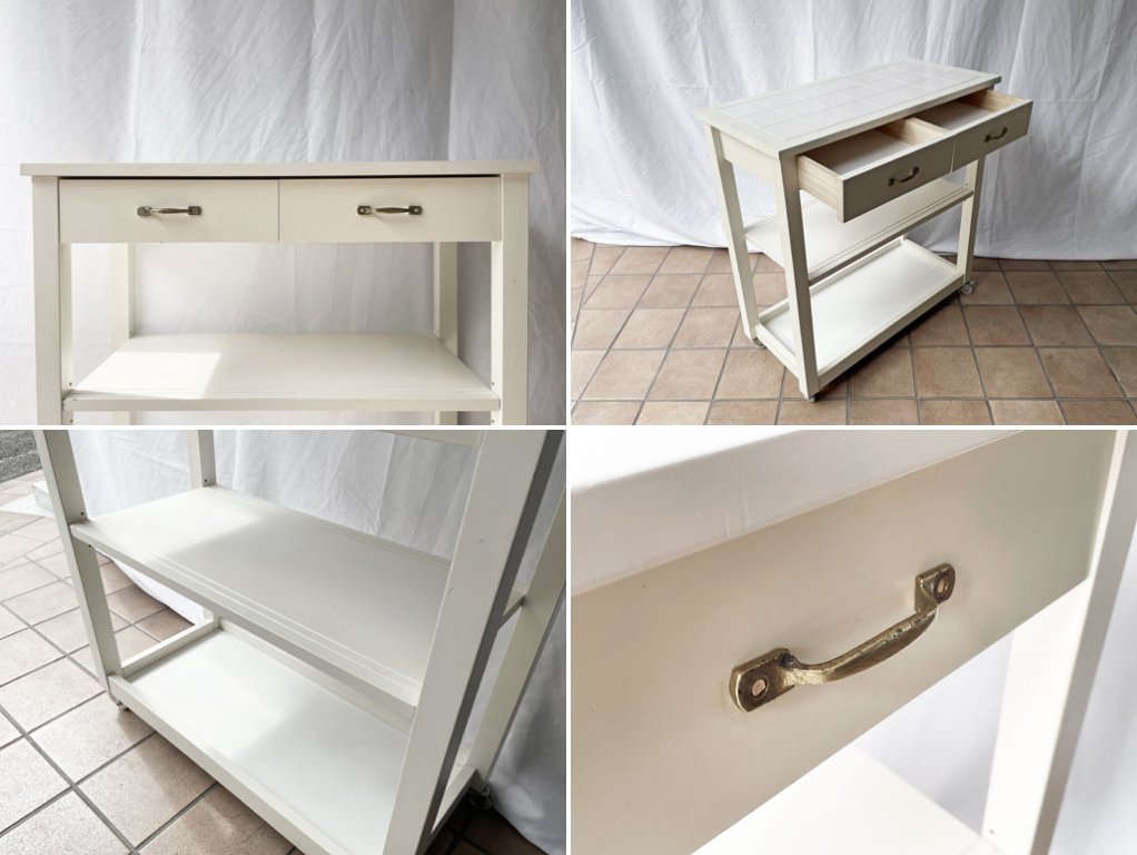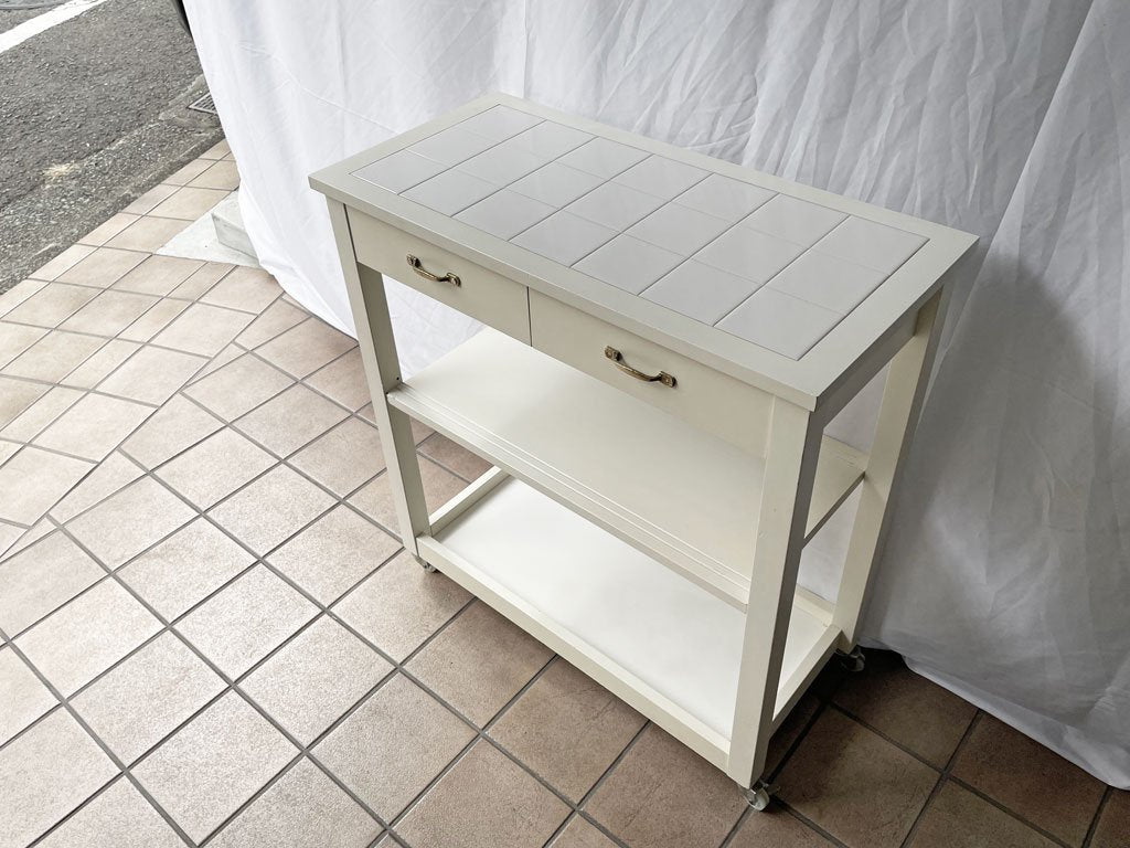 清潔感溢れるホワイトでまとめ上げられ、キッチンにはピッタリな1点。天板にはタイルが敷き詰められ、水気や熱にも強い為、お料理中の強い味方となってくれそうです。