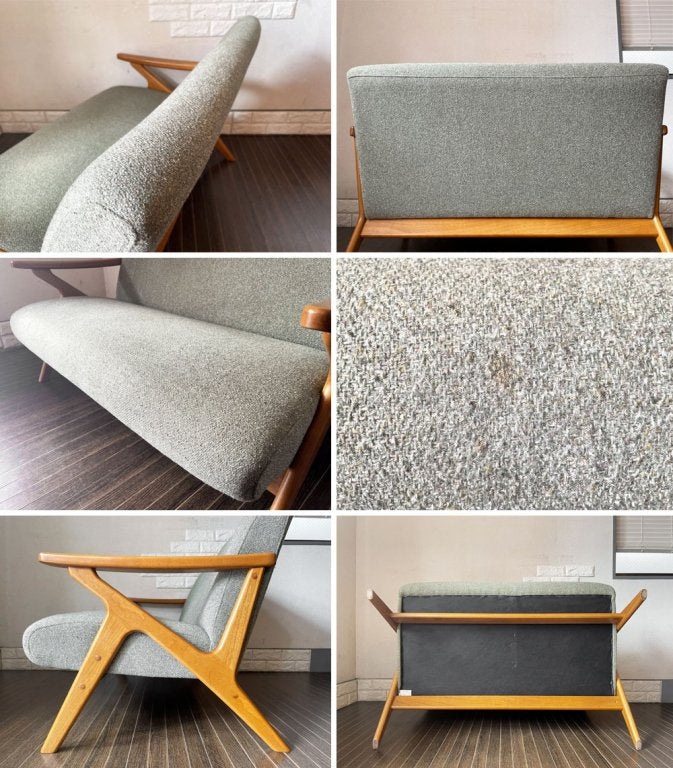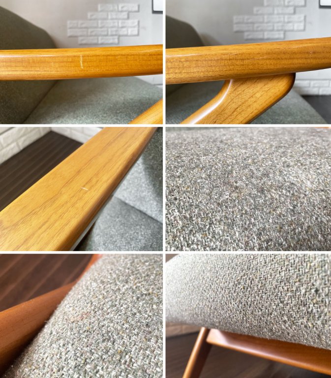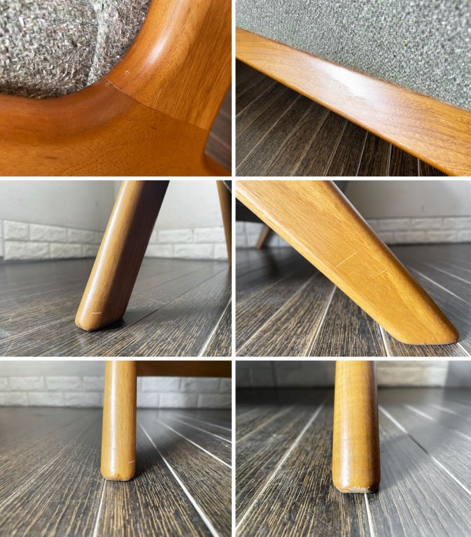 使用に伴い、フレームには表面の削れや擦れ、傷、打痕、くすみなどの取り切れない汚れ等が複数見受けられます。また、ファブリックには毛羽立ちや毛玉が確認できるとともに、座面に数か所シミ汚れがございます。いずれも著しく美観を損ねるダメージではございませんが、詳細画像をご確認くださいませ。