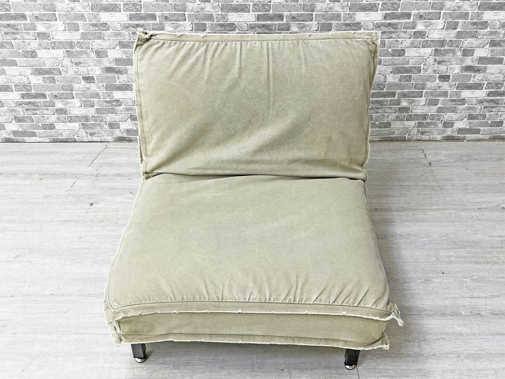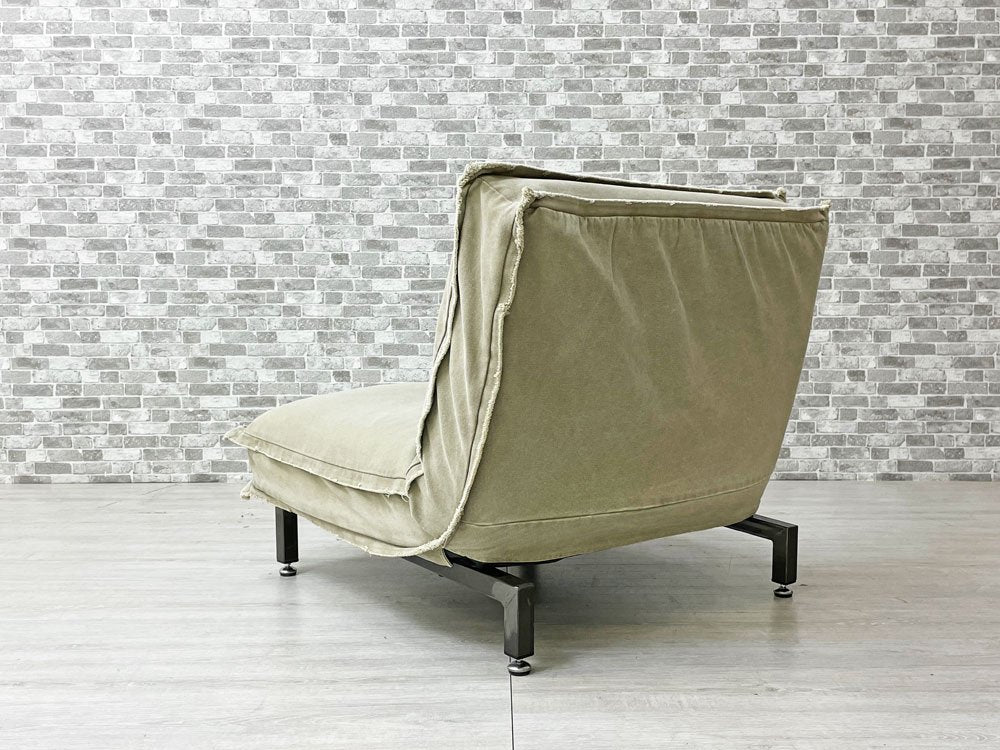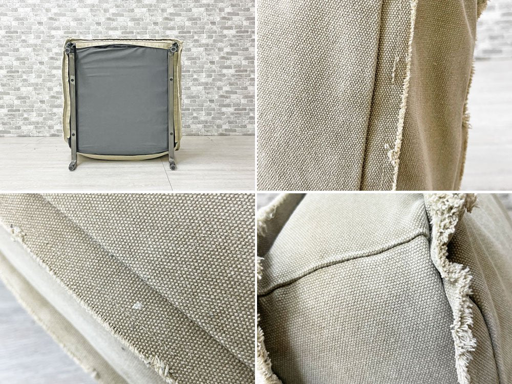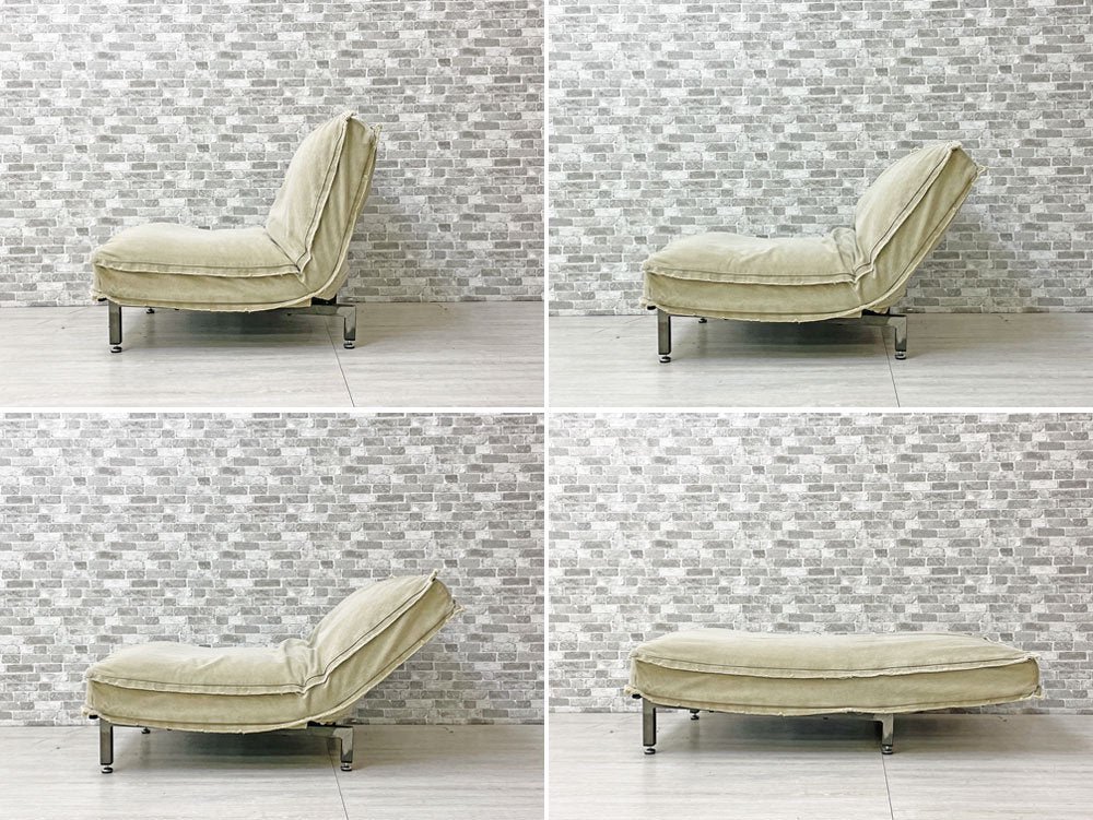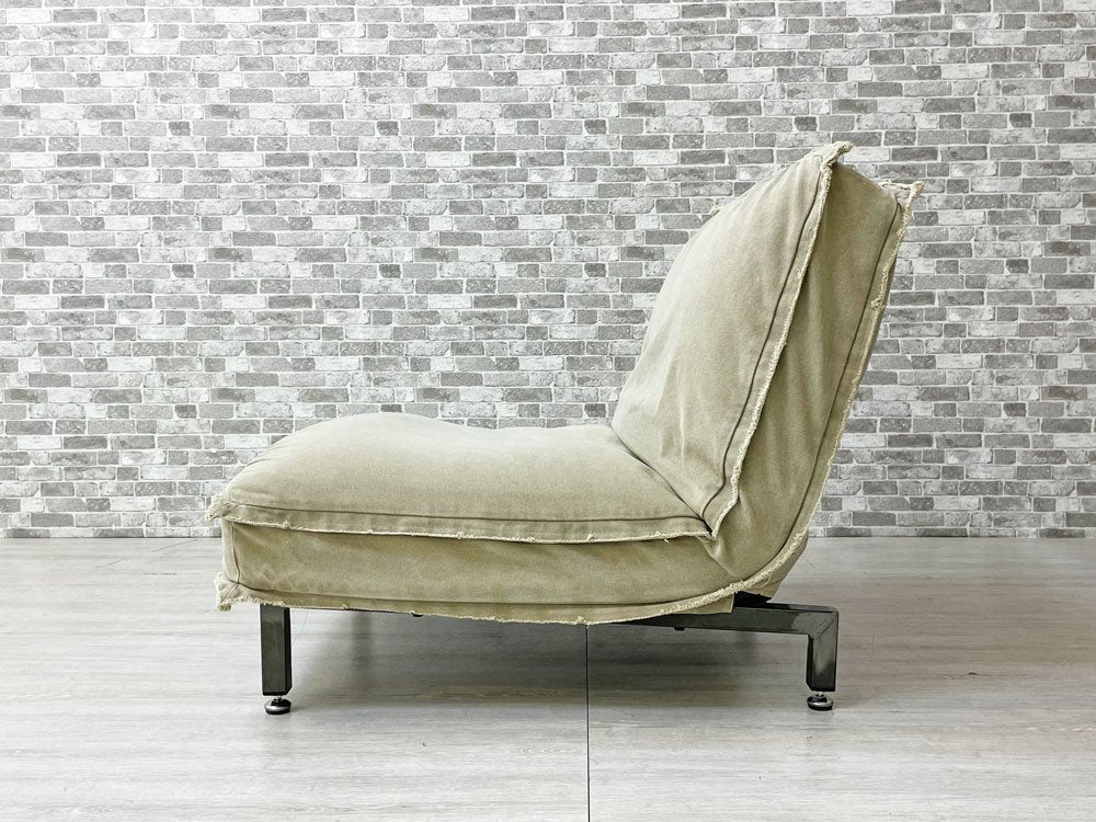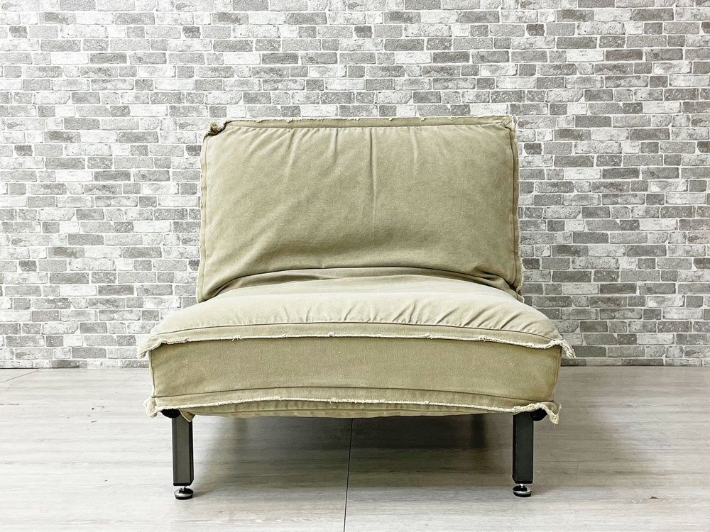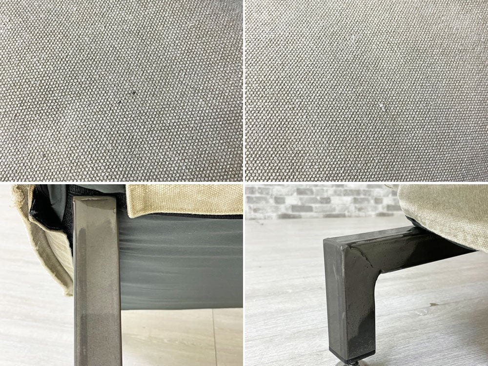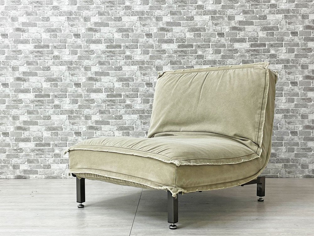 無骨なスチルフレームながら、クッションの帆布生地が暮らしに溶け込み、また確りとコシのある質感により心地よい着座を実現。アームのないスッキリとした印象は手狭な日本の居住空間でも圧迫感を抑えてレイアウト可能です。背もたれはリクライニング仕様なので、無段階で角度調整頂けます。脚先にはグライズを備え、多少凹凸のある床面でも快適に設置出来ます。