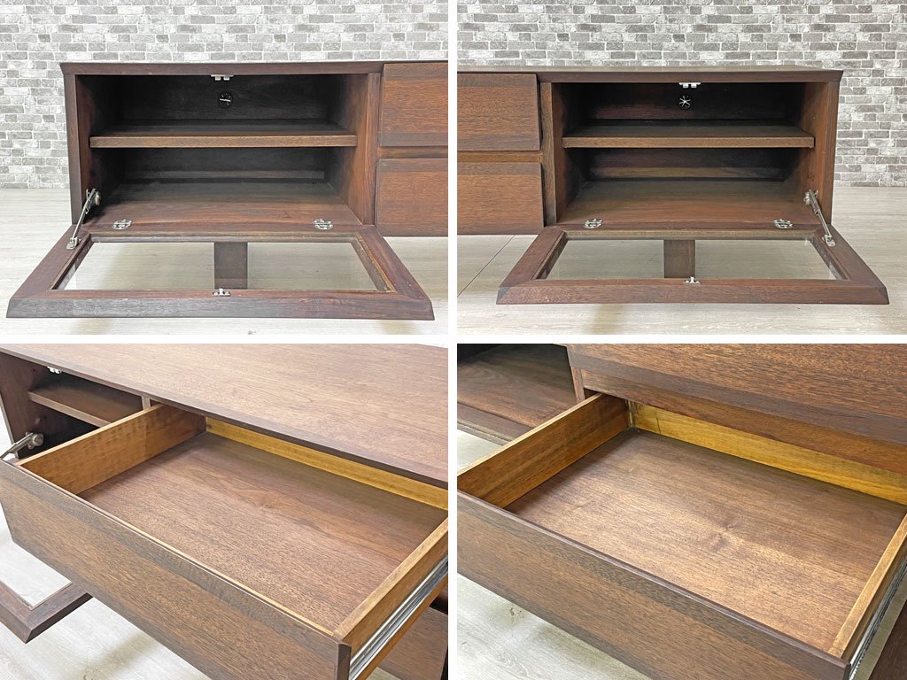 左右の引き出しはドロップダウン式。ガラスが前面に採用されている事で見通しが良く、リモコン操作もしやすい組み合わせです。