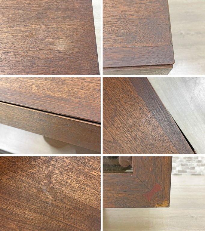 使用に伴う擦れや傷、色褪せ、ペイントロスなどがございます。庫内の棚板の高さ調整のダボ穴が複数箇所やや広がり、通常よりも緩く感じますが、現状ご使用には影響御座いません。また両ドロップダウン扉の開閉がやや硬くなっており、脚部付け根にあたる庫内内部の棚板が一部隆起しておりますが、現状ご使用には影響がない物かと思われます。現状のコンディションを考慮して比較的お求めやすいお値段とさせて頂いております。予めご了承下さいませ。