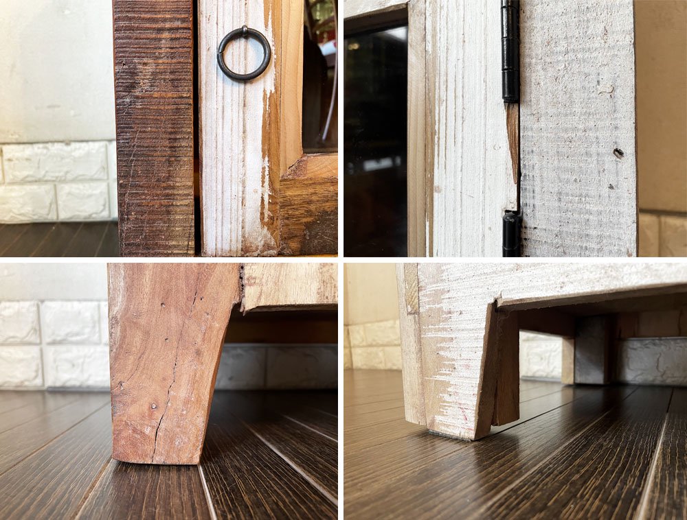こちらは、古材を使用したお品物です。使用に伴う擦れや傷、取り切れない汚れのほか、木部の欠けや亀裂、ペイントの剥がれ等が随所に見受けられます。また、ガラス面の若干の小傷や汚れ等はございますが、いずれもご使用に支障となるほどのダメージではございません。ビンテージのような風合いとしてお楽しみ頂きながら、これからも実用頂けます。