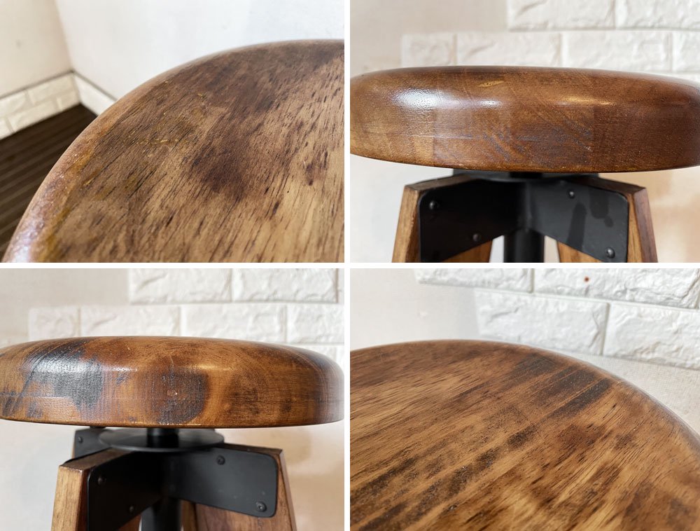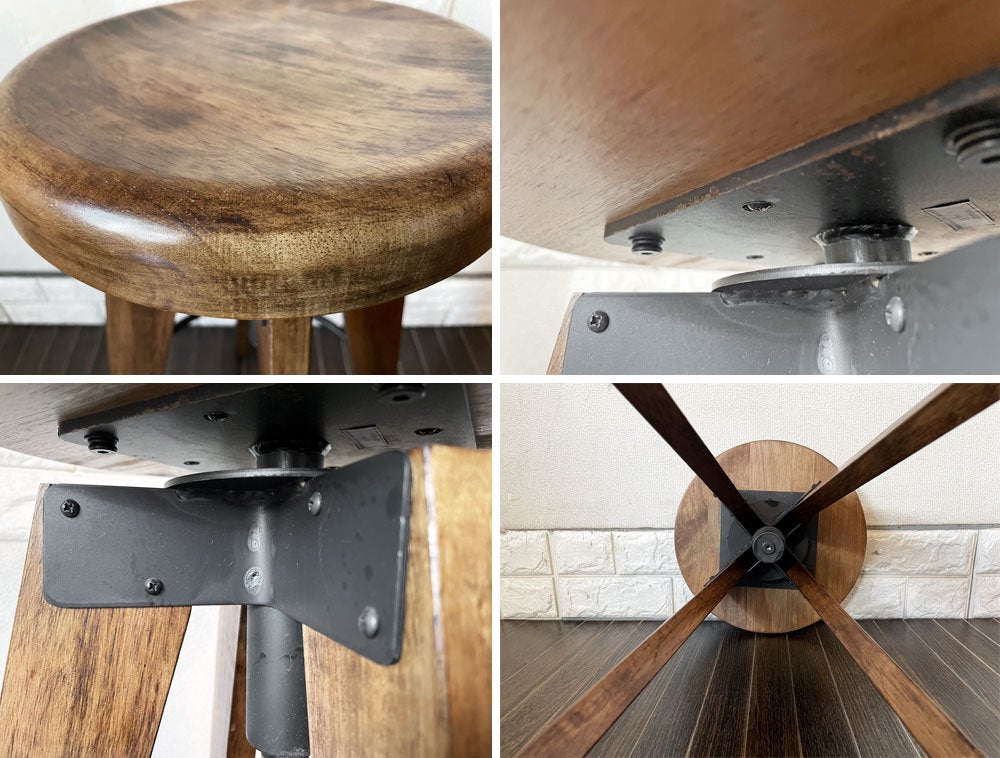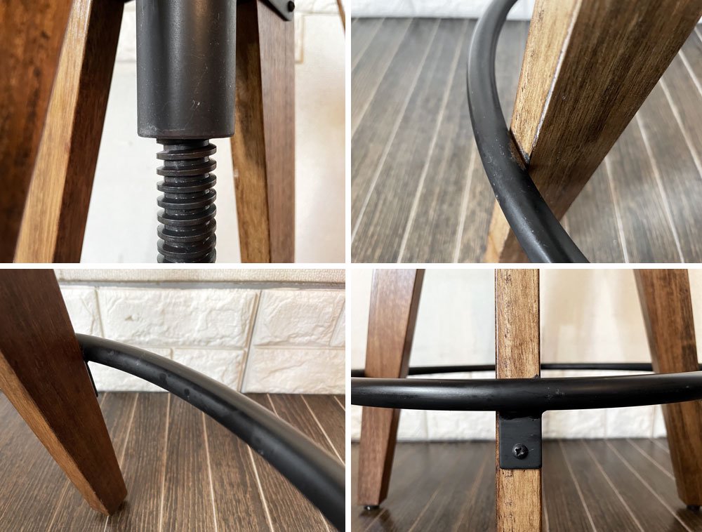 こちらは、エイジング加工が施されたお品物です。ウッド部分には擦れや傷、黒ずみなどの変色等がございます。また、アイアンにはくすみや錆、色ムラ、取り切れない汚れ等が見受けられるとともに、座面昇降時には金属の摩擦音が生じます。