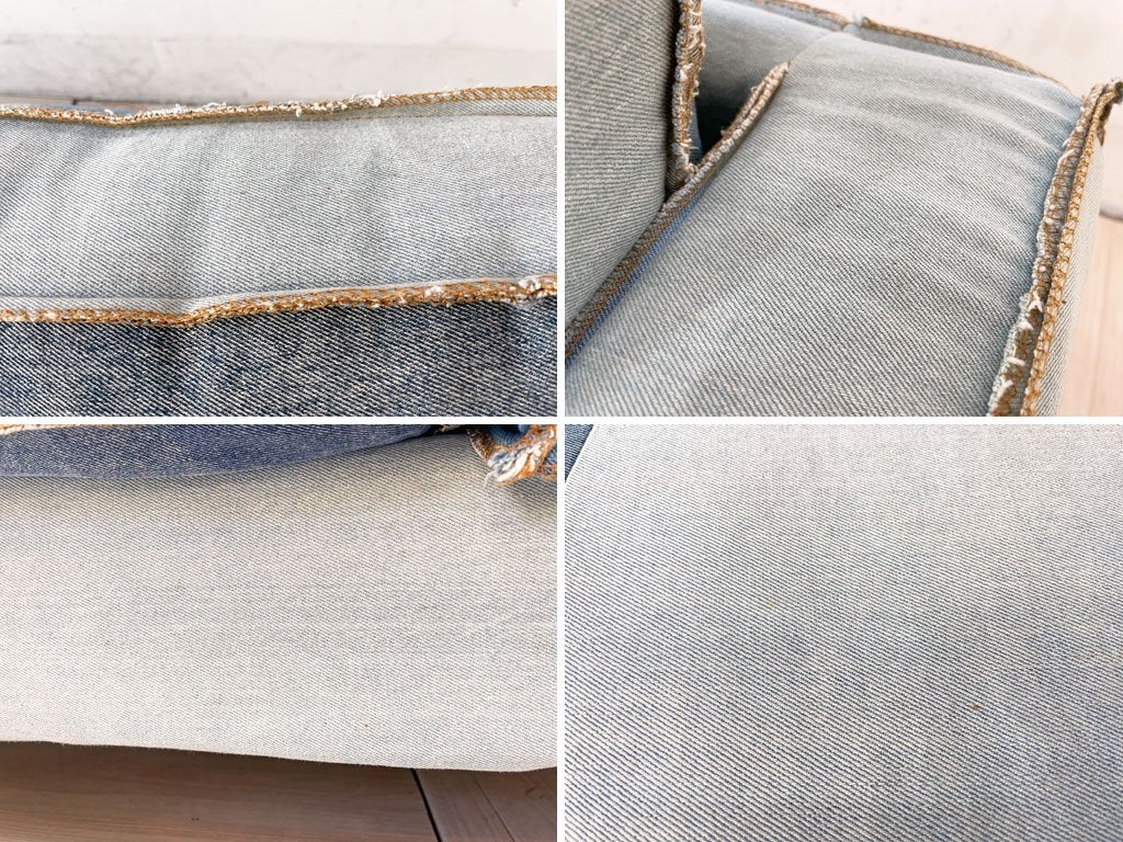デニム生地にホツレや裁縫ムラなどがございますが、製造時からの仕様となります。また、脚部の傷やスレ、デニム生地に若干のシミや向かって右側にアーム先端角に縫い直しの痕がございますが、クッションのヘタリや大きく目立つようなダメージなどもございません。USED品として概ね良好なコンディションを保っております。