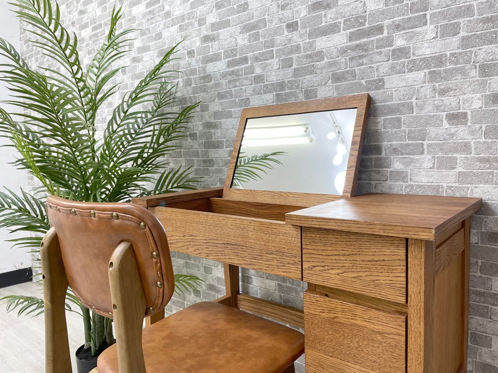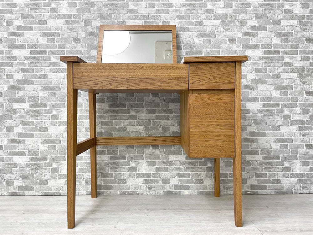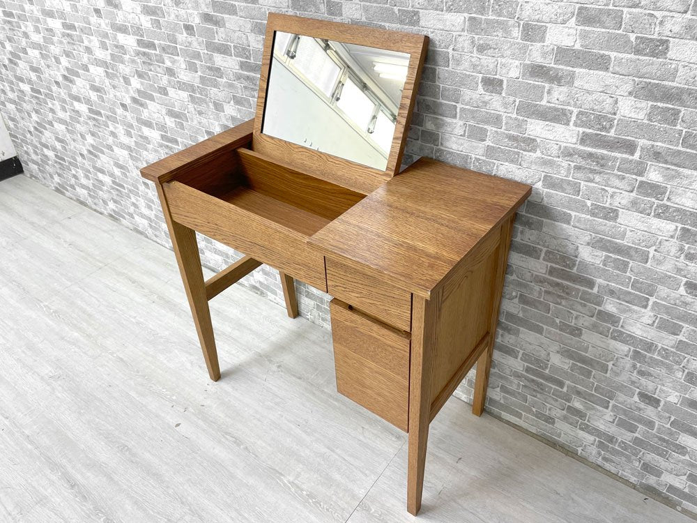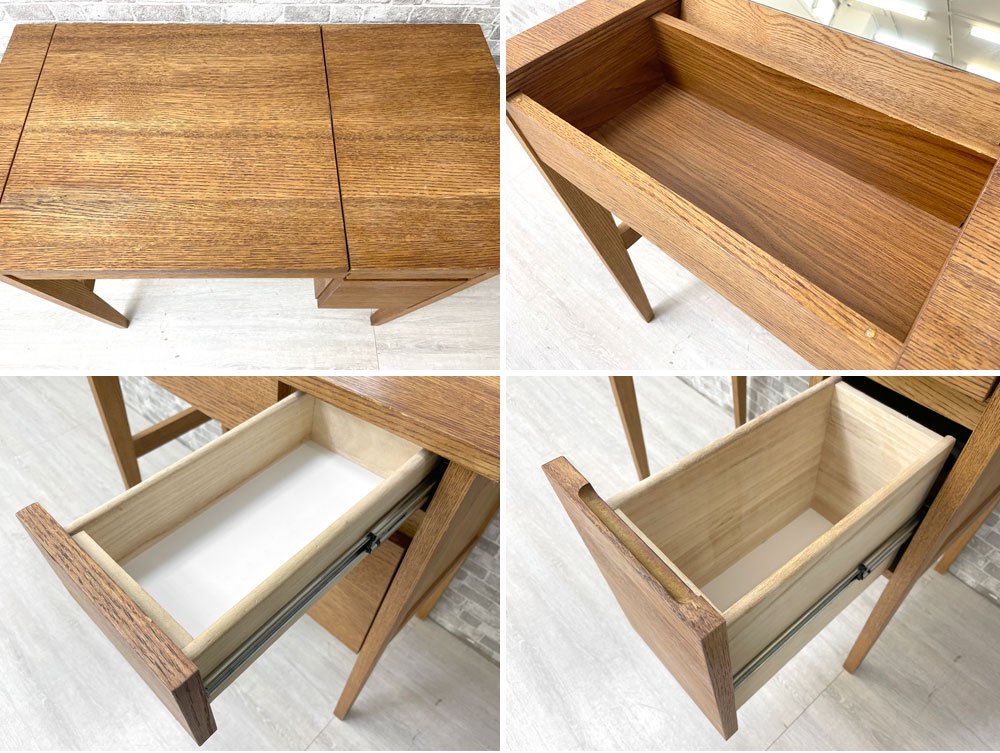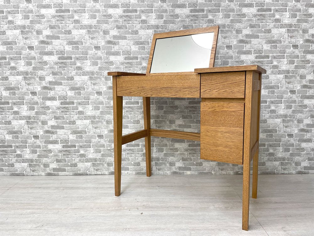 こちらは惜しまれつつ廃番となった「ノート NOTE」シリーズのドレッサーデスク。温かみあるオーク材を使用し、必要な時だけ天板を引き上げ鏡を使用できる機能的な造りです。抽斗収納下段は、深めの抽斗となっており、ボトルタイプの化粧品もスッキリと収納頂けます。