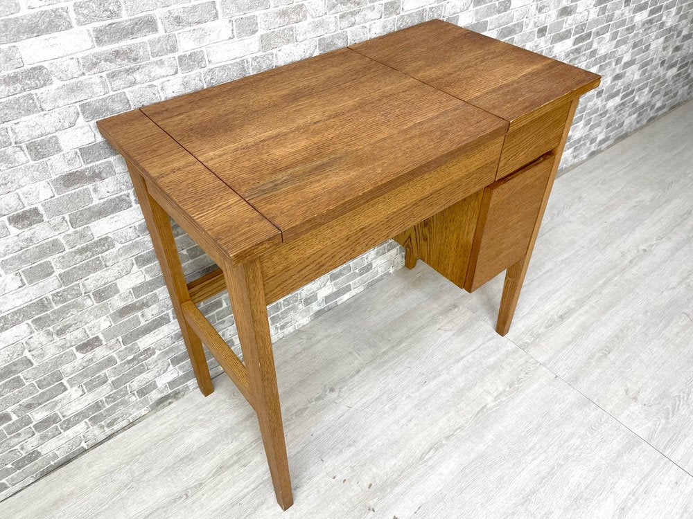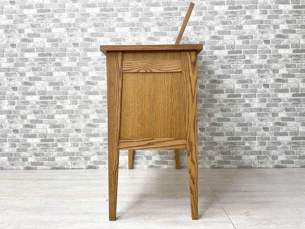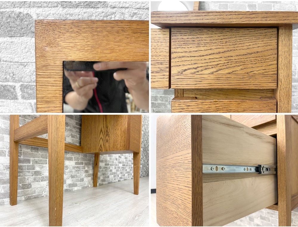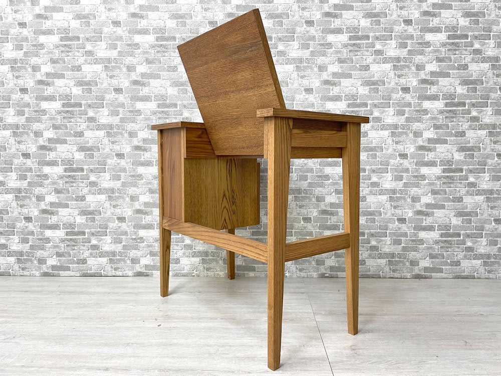こちらは惜しまれつつ廃番となった「ノート NOTE」シリーズのドレッサーデスク。温かみあるオーク材を使用し、必要な時だけ天板を引き上げ鏡を使用できる機能的な造りです。抽斗収納下段は、深めの抽斗となっており、ボトルタイプの化粧品もスッキリと収納頂けます。