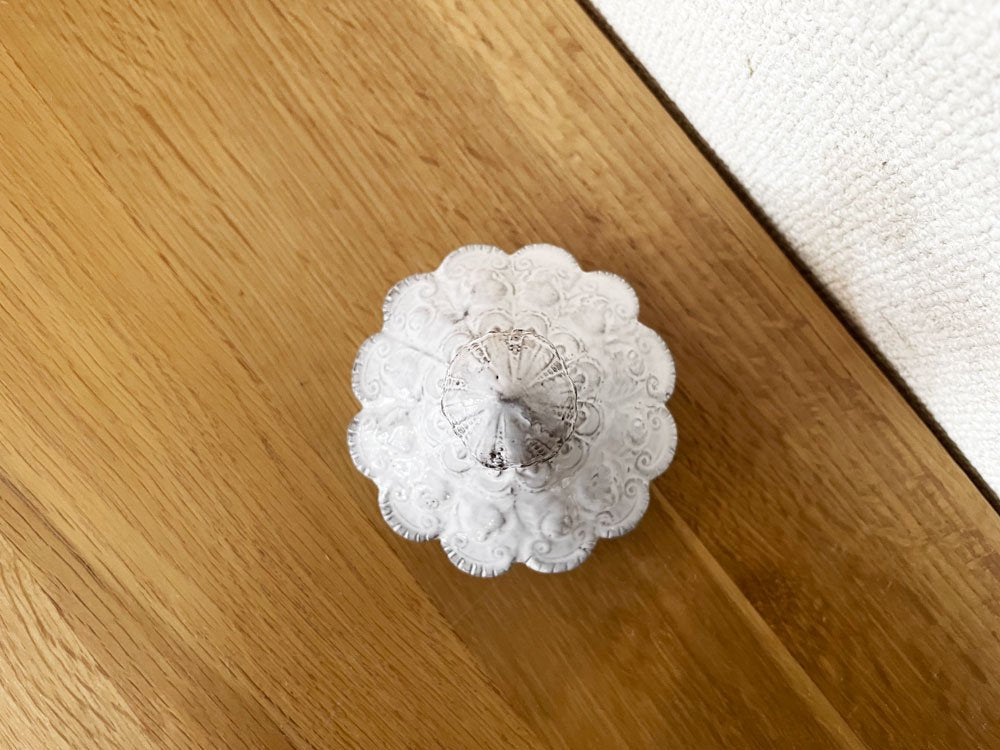 今回は、細かな模様が施されたポットカバー。花のつぼみのようなつまみが印象的です。