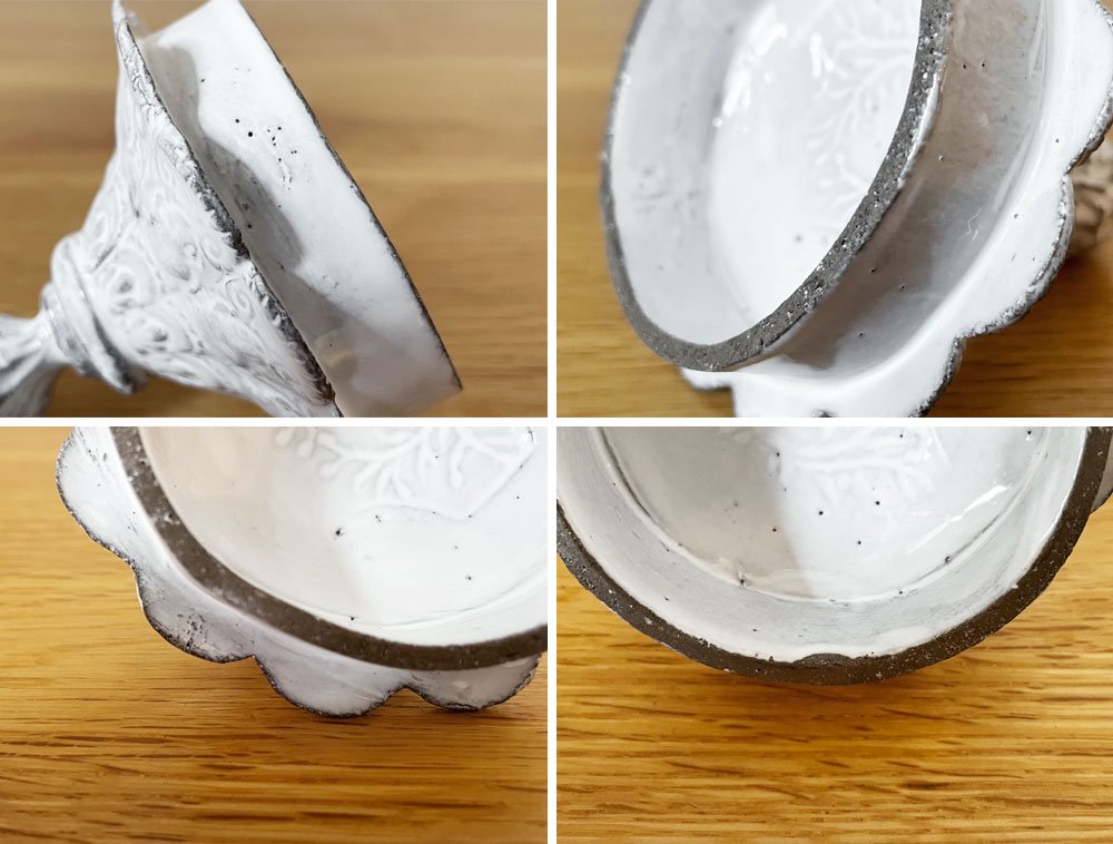 製造時に出来た傷や小さな穴が複数ございます。また、底面には窯傷が見受けられるほか、釉薬のムラが全体に確認できます。その他、使用に伴うわずかなスレ傷等はございますが、いずれも著しく美観を損ねるダメージではなく、十分実用頂けるコンディションを保っております。