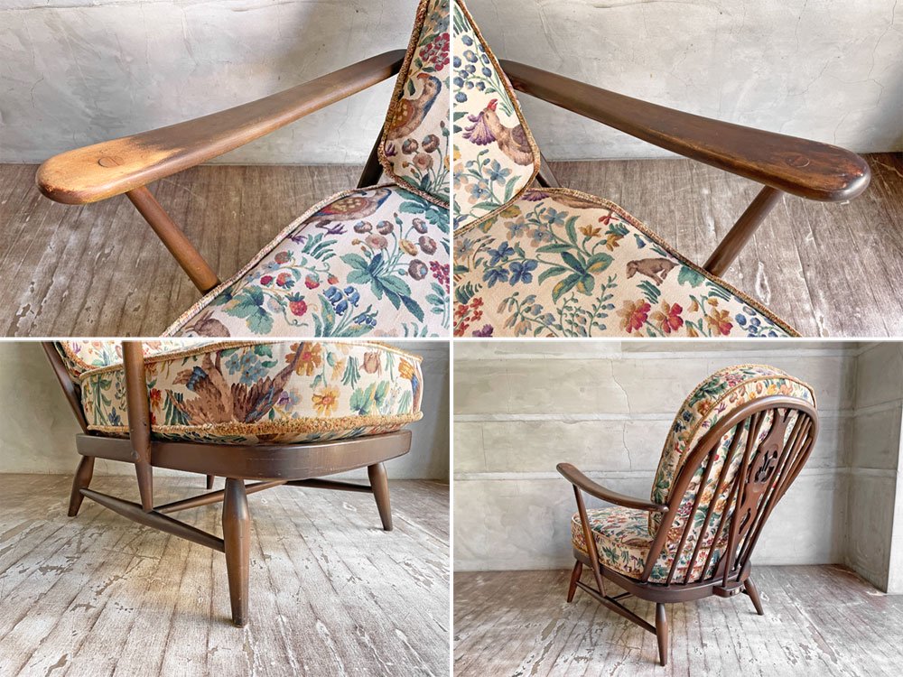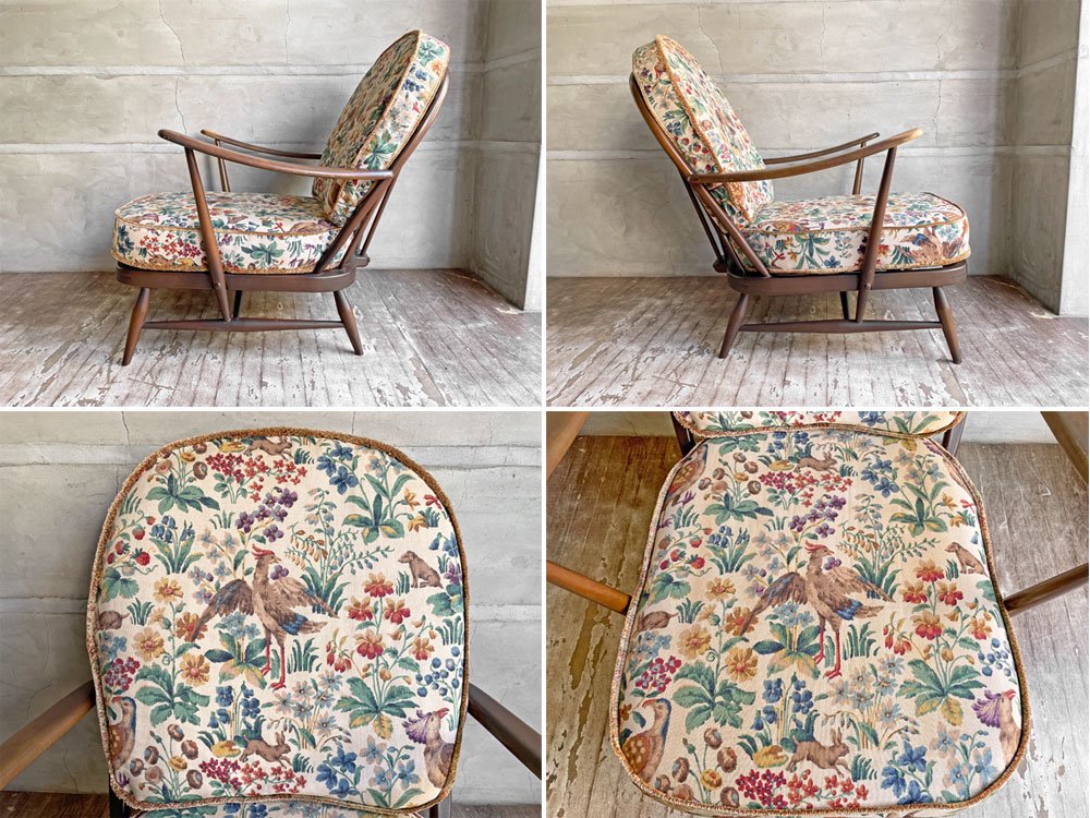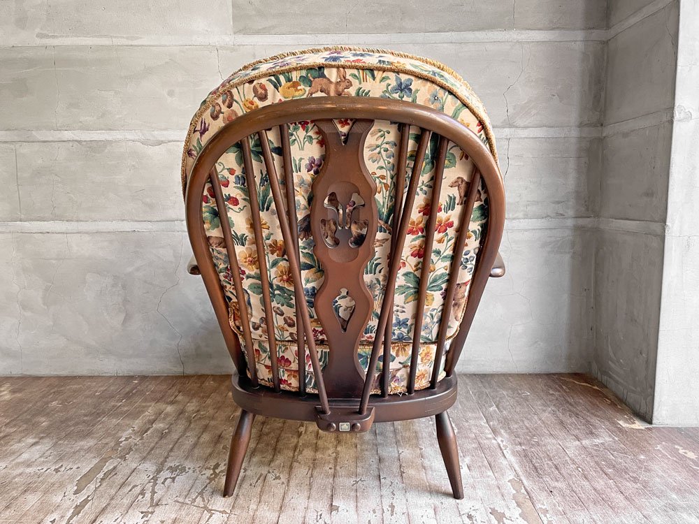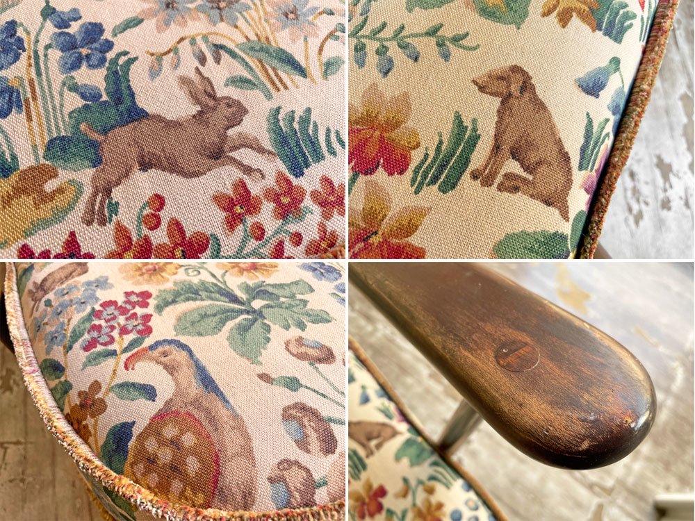 シスル(アザミの花)が象られた背もたれは装飾的で華やか。ファブリックも色とりどりの動植物が描かれ、UKビンテージならではのアクセントが散りばめられたどこから見てもお楽しみ頂けるラウンジチェアです。