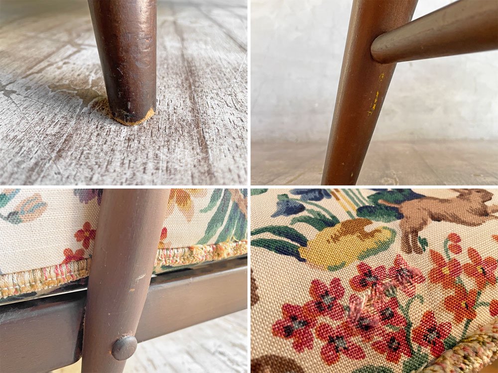 フレームに細かな打痕や擦り傷、アーム先端にペイントロス、ファブリックに一部破れがございます。クッションは経年による軽度の加水分解が見られますが、着座に支障をきたすほどではございません。