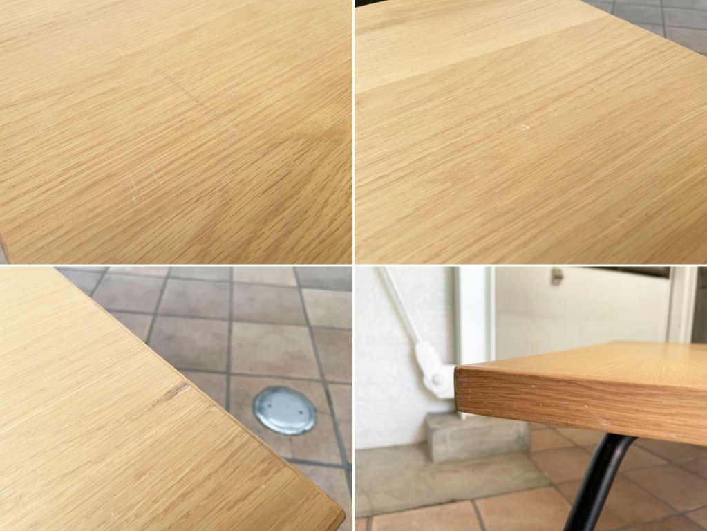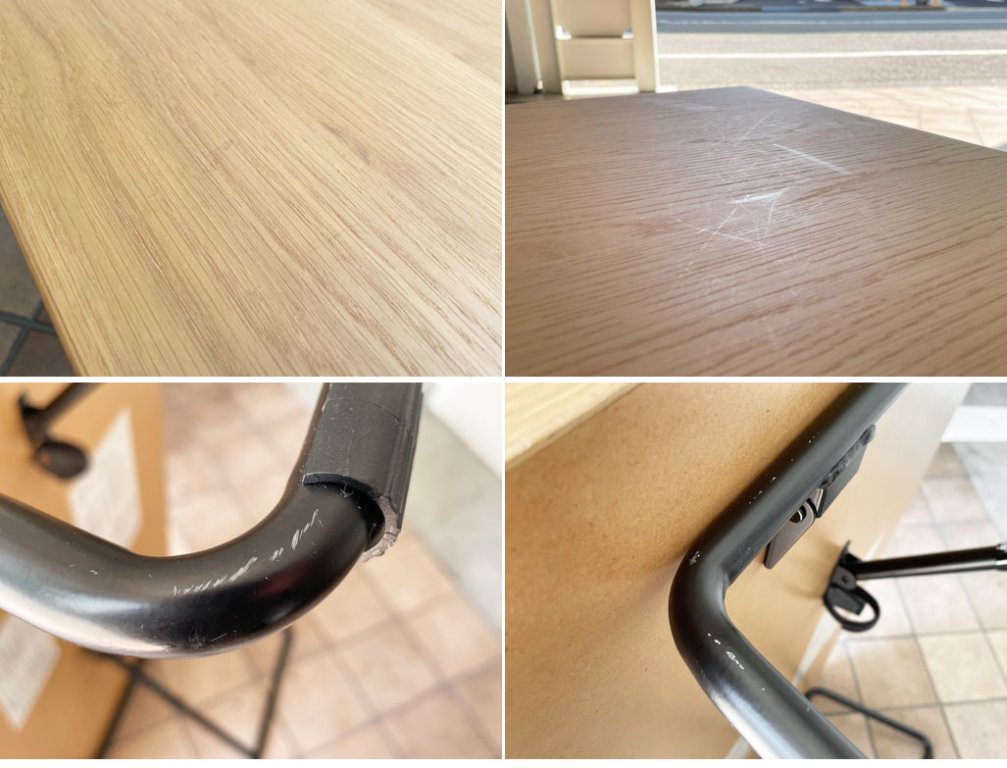使用に伴い天板は全体的に薄い線傷や擦れがございますが、美観を大きく損ねるものではございません。その他若干の黒ずみやスチールに打痕等も確認できますが目立つものではありません。大きなダメージは見受けられず、中古品としましては概ね良好なコンディションを保っております。