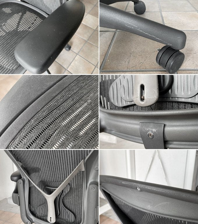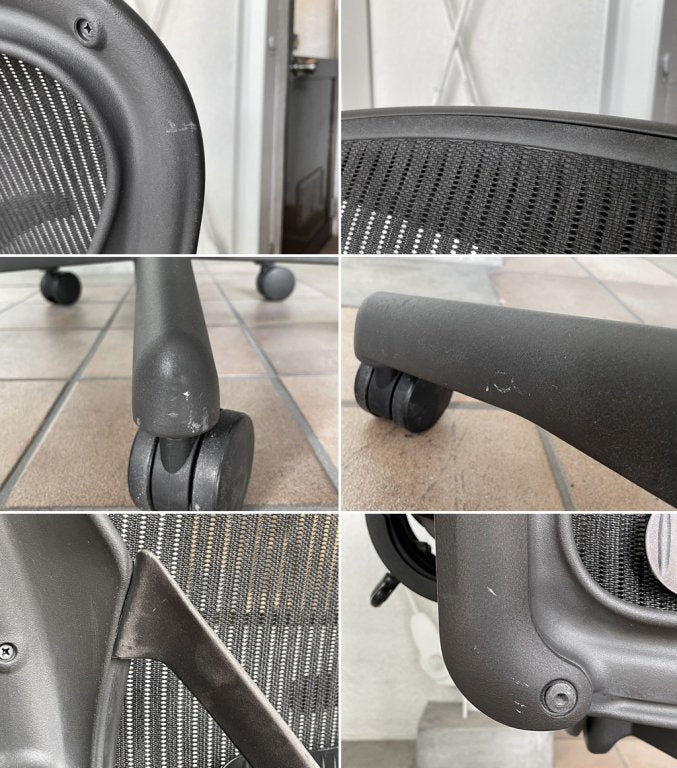 使用に伴いフレームには打痕、擦れ、着色、ポスチャーフィット部の色褪せやアームパッドの劣化による細かな表面の剥がれの他、メッシュの網目や細かな隙間に取りきれない汚れ、またキャスター内部には除去しきれない毛等が確認でき、全体的使用感が感じられます。ガス圧はやや減少しているように感じられますが、問題なくご使用頂ける程度です。バナナクッションとポスチャーフィットのパッドは新品に交換されており、気持ちよくお使い頂けるかと思います。その他機能は問題なく可動しており、まだまだ実用頂けるコンディションです。