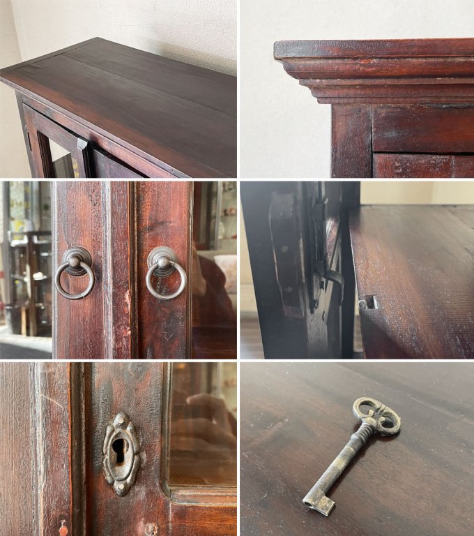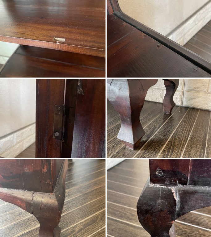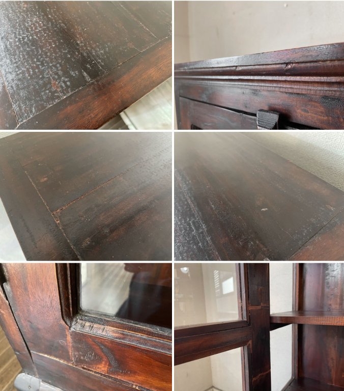 その他、扉を閉じた際の隙間や脚部の若干のぐらつき、棚板が平らではないなど構造上のダメージが確認できます。これからもまだまだ実用頂けるコンディションを保っていますが、ディスプレイや家具の移動の際は十分ご注意下さいませ。