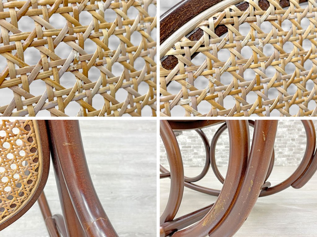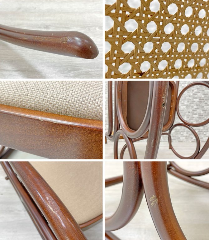 使用に伴う細かな擦れ傷の他、打痕、ラタンのわずかなほつれ、接地面の擦れ、表面塗装の剥がれ、右腕側のアームにやや目立つ打痕、左腕側のアーム付け根表面のヒビ等ございますが大きく美観を損なうものではございません。ご使用に問題となるダメージは無く、曲木家具ならではの軽くしなやかな座り心地を引き続きお楽しみ頂けるコンディションを保っております。