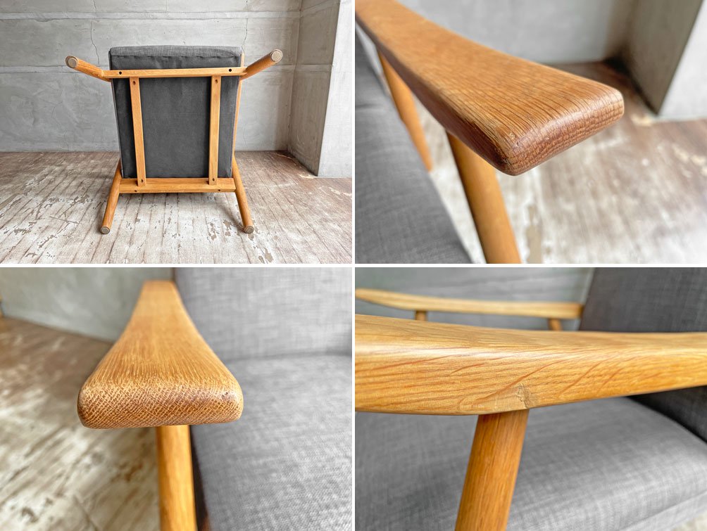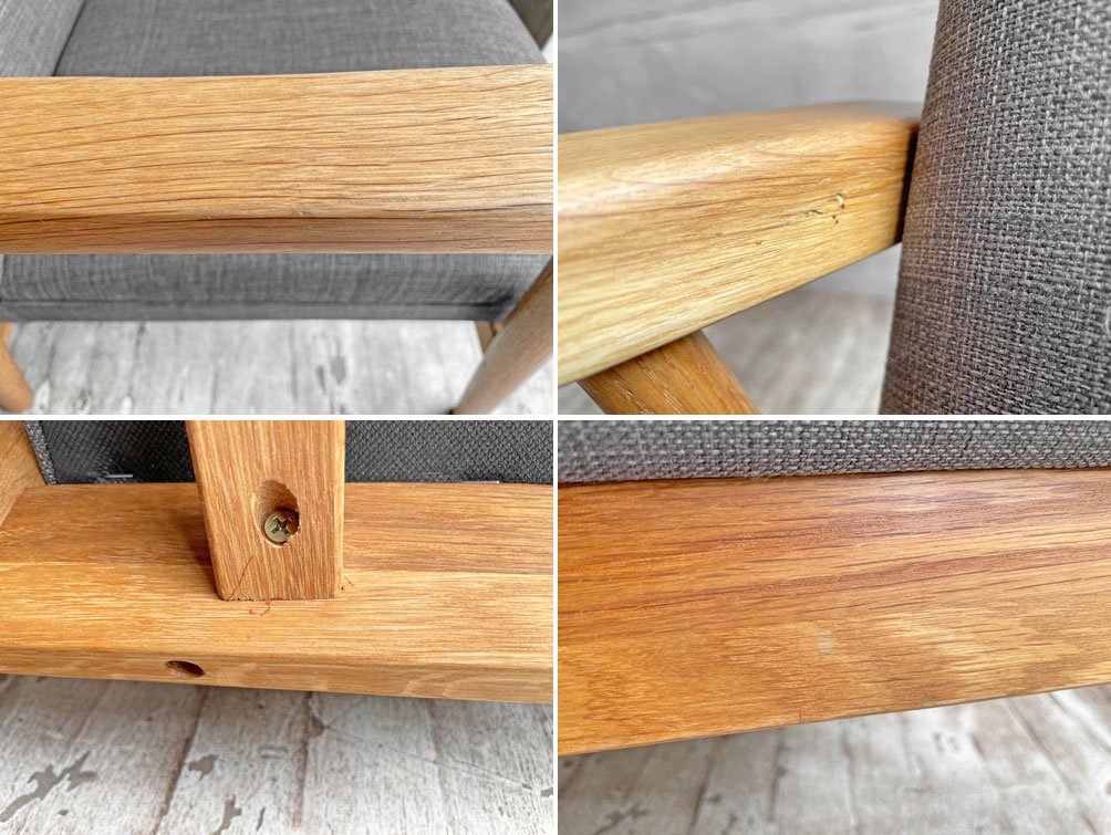 使用に伴い擦れや軽微な打痕、肘掛け側面に欠けや表面に無垢材特有の起伏がございます。使用に問題となる大きなダメージは無く、概ね良好なコンディションを保っております。