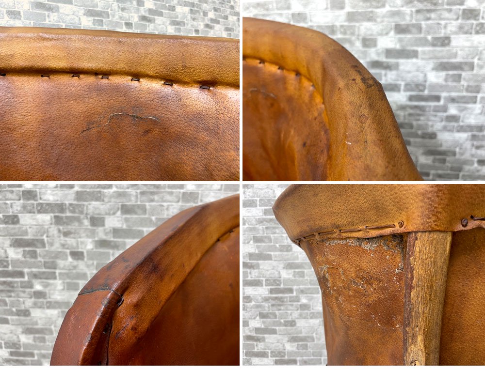 レザーに色ムラや擦り傷があり、背もたれの一部には10cm程度の破れもございます。その部分の背面には糊跡、脚部付け根には黒い接着剤で補修をした跡がございます。