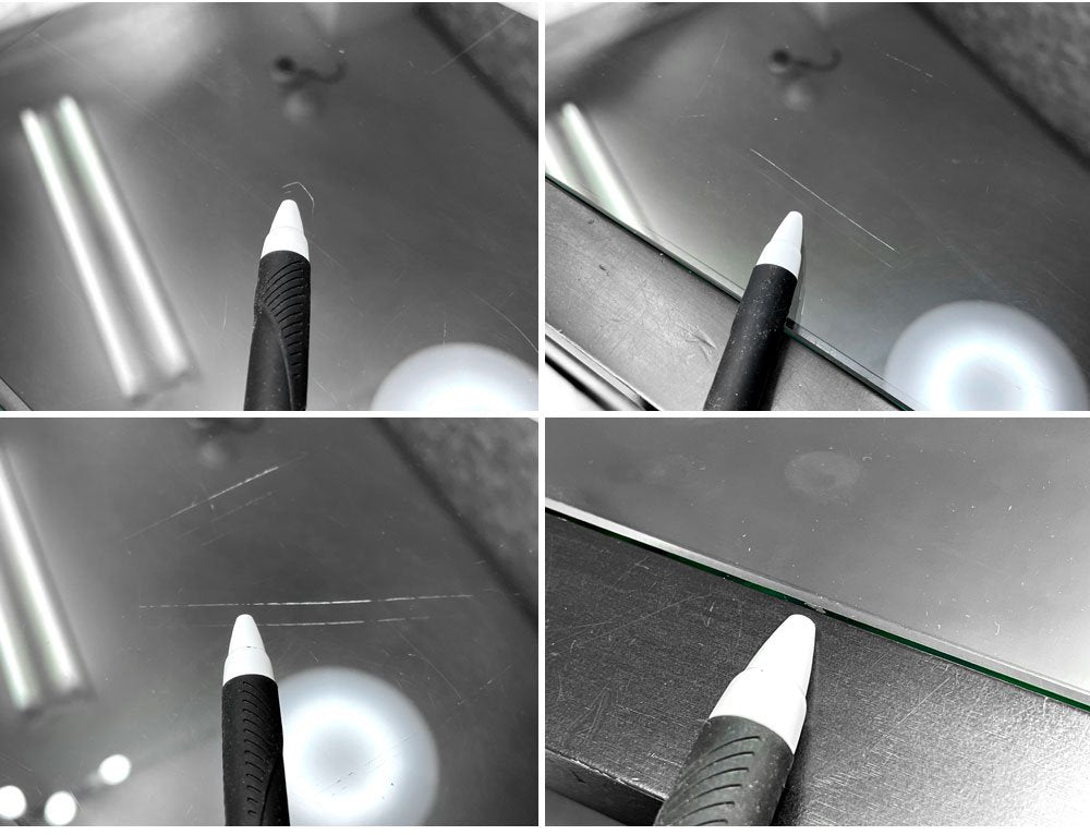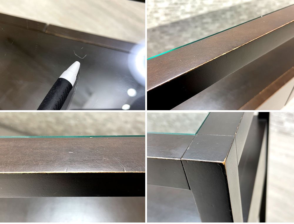 ガラス天板に線傷が複数箇所、フレームには打痕や線傷があり、縁には擦れによるペイントロスが多くございます。