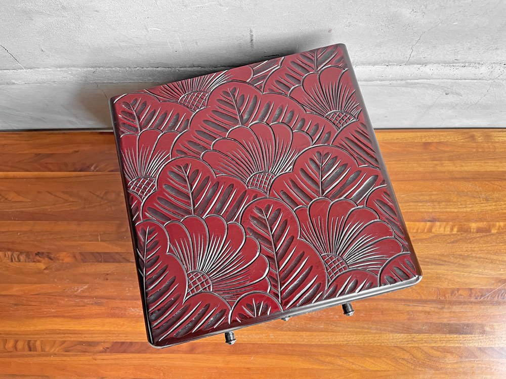 「ひっかき」と呼ばれる独特の道具から生み出される彫りの深い、男性的な流れるような曲線と、材料の美しさを最大限に生かし、朱漆に炭を重ねて塗っていく「日光堆朱塗り」と呼ばれる漆塗りが特徴。