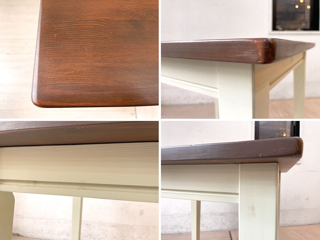 使用に伴う傷やスレ、色ムラやペイントロス、塗装のヒビなどがございます。また、パイン材特有の節の割れなどがございますが、製造時からの使用となります。天板にやや目立つ線傷がございますが、大きく美観を損ようなダメージなども無く、ご使用に問題のある箇所などもございません。これからも問題なくお使い頂けるコンディションを保っております。