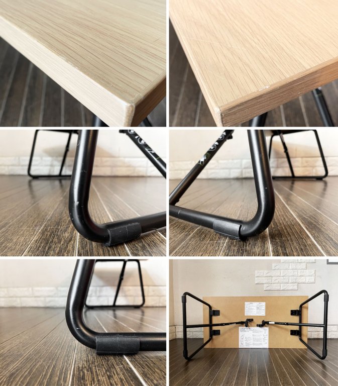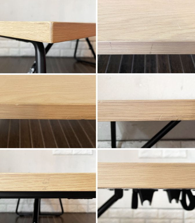 使用に伴い、天板の中央付近にはやや目立つ黒ずみ汚れが確認できます。また、木部には傷や擦れ、縁の削れ、突板の剥がれ、打痕、取り切れない汚れ等が散見されるとともに、スチール脚には小傷が複数見受けられます。折りたたみの動作やご使用に問題となるダメージはございませんが、やや使用感のあるコンディションを加味したお求めやすい価格での販売となります。この機会にぜひご検討くださいませ。