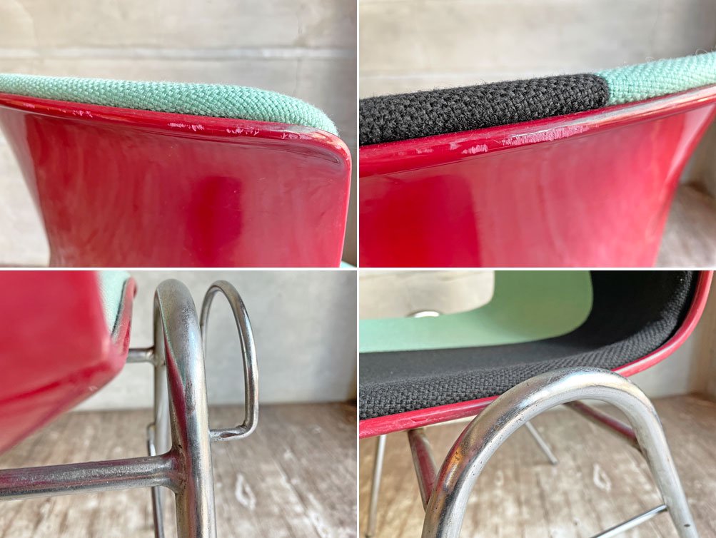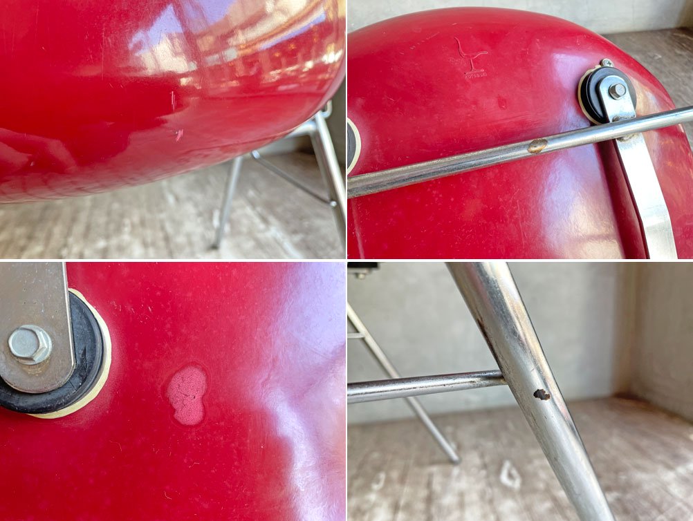 こちらはビンテージのお品物です。使用と経年に伴いシェルに打痕、スレや線傷、金属製脚部に取り切れないサビ、くすみやスレが見受けられます。また、脚先キャップがすり減っていますが、ガタつきは無く、使用上の強度にも問題はございません。その他、問題となるようなダメージも見受けられず、ビンテージ品としては概ね良好なコンディションを保っております。
