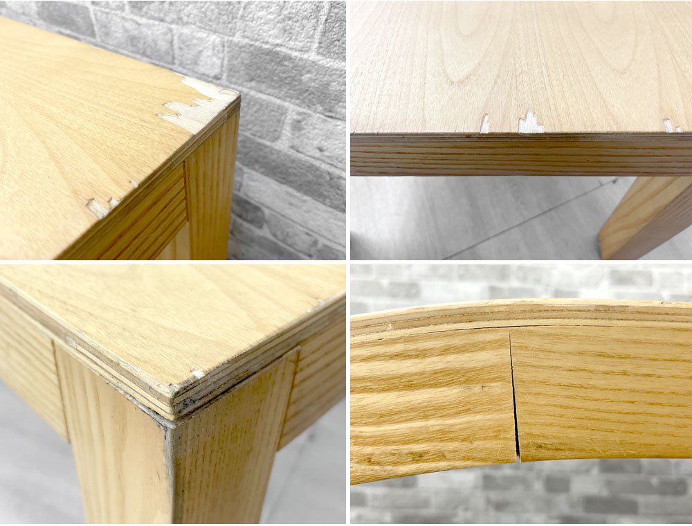 天板に突板の剥がれが多数あり、線傷や取り切れない汚れも側面にございます。斜めになる部分の接合部分には隙間が生じており、ぐらつきはないものの、やや目立つものとなっております。