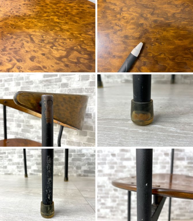 アイアン部分にはホワイトペイントによる落としきれない汚れや擦れ傷、塗装の剥がれによる錆が所々に見受けられ、また脚部先端は経年により腐食が見られるため、イス脚キャップはそのまま装着した状態でのご使用をお勧めいたします。