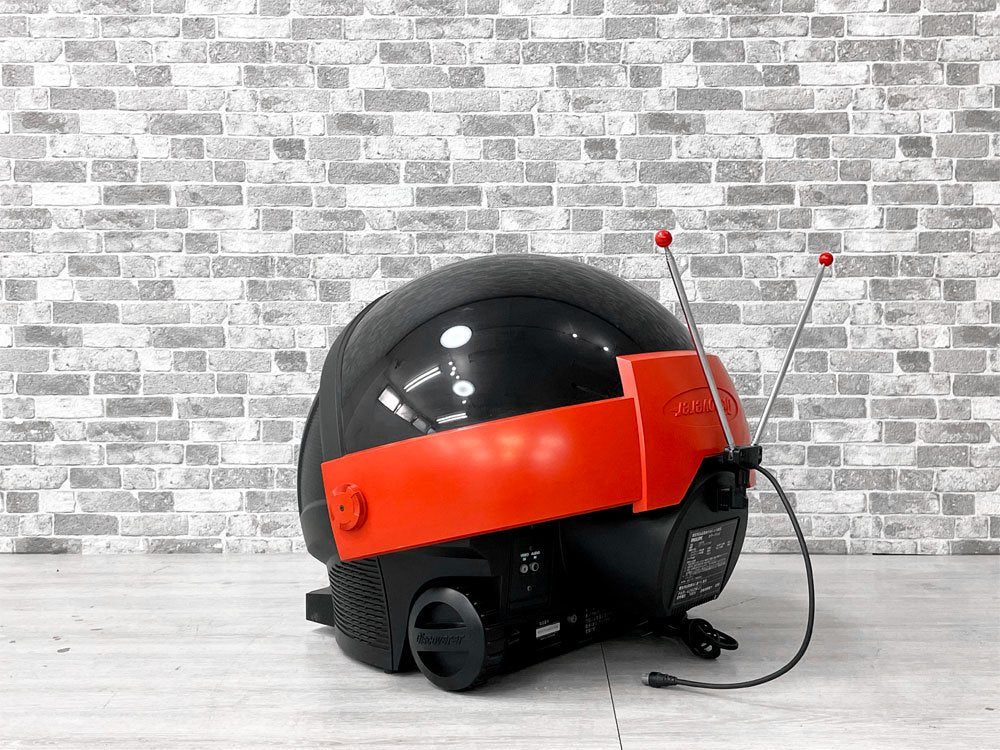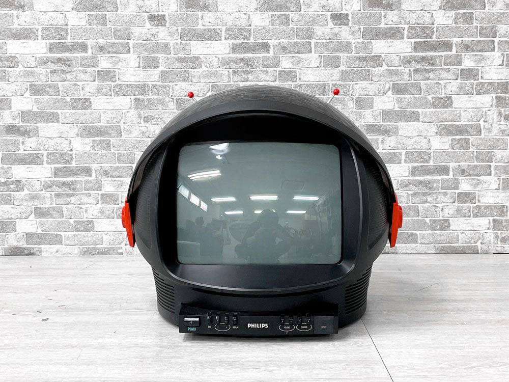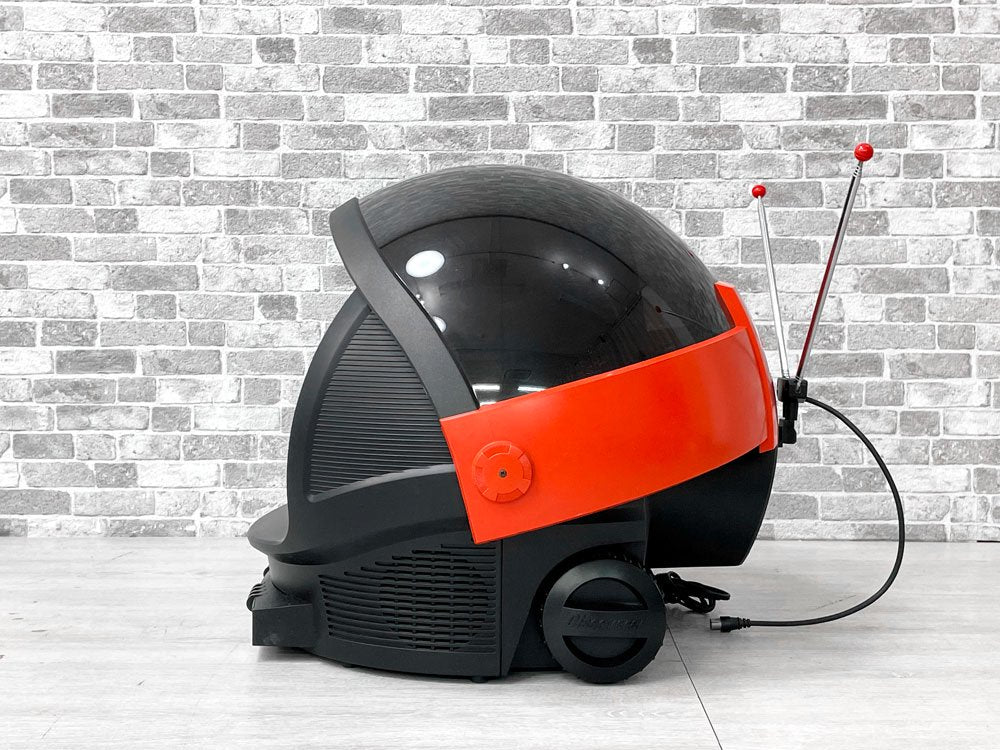14型のブラウン管モニターに対し、特撮ヒーローの様な存在感のあるヘルメット型のバイザーがひと際目を引く斬新なフォルム。鑑賞しない時はバイザーを下に閉じる事で、モニターを目隠しすることができます。背部のある古いロボットの様な伸縮アンテナもアクセントに。宇宙デザインを意識した未来派テレビです。