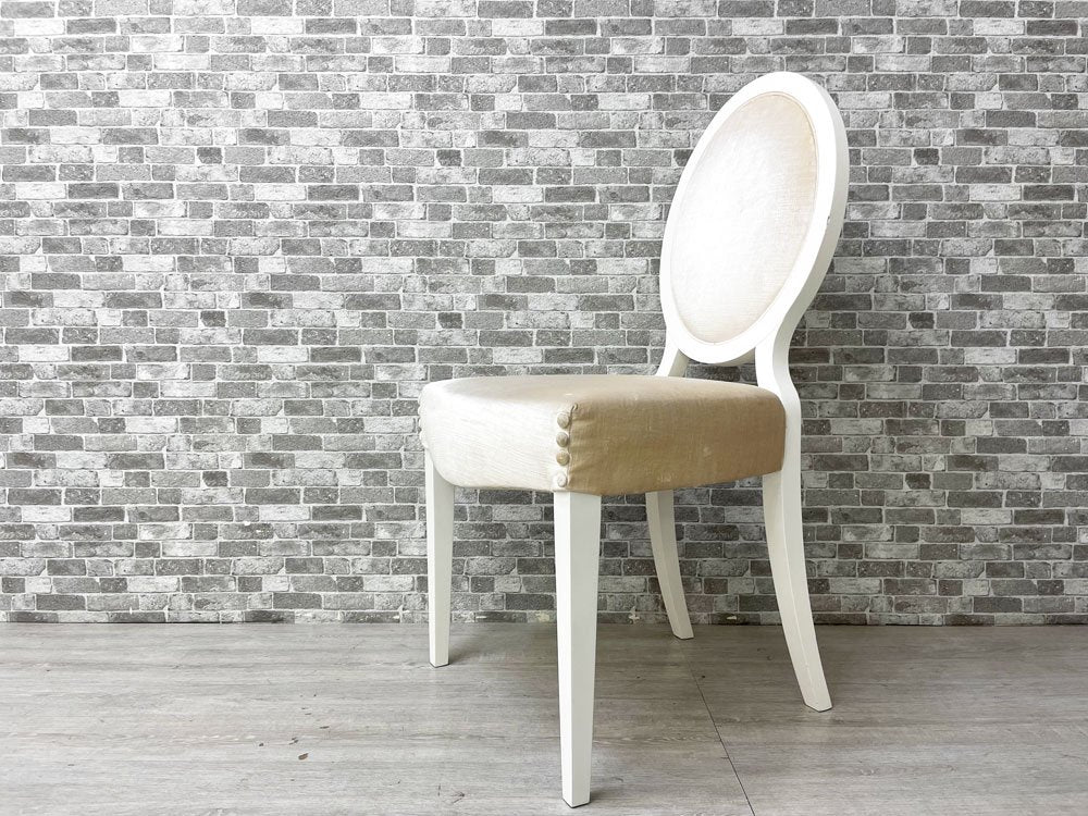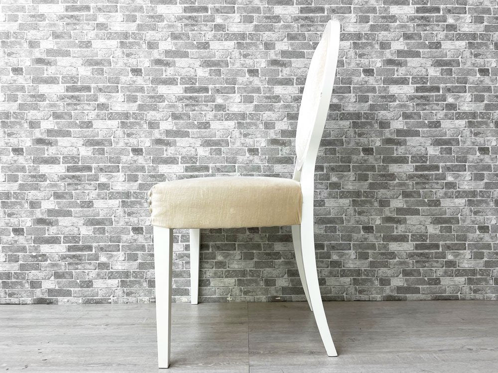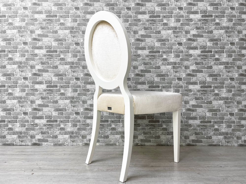 こちらの『 ガイア Gaia 』は、モダンとクラシカルを融合させ、曲線を基調にデザインされたダイニングチェアです。ホワイトペイントが施されたウッドフレームにベロア生地と思われる柔らかな肌触りのファブリックを組み合わせ、程よい弾力のクッションにより心地良い着座を実現。アームの無いスッキリとしたデザインは、圧迫感を与えずにレイアウト頂けます。