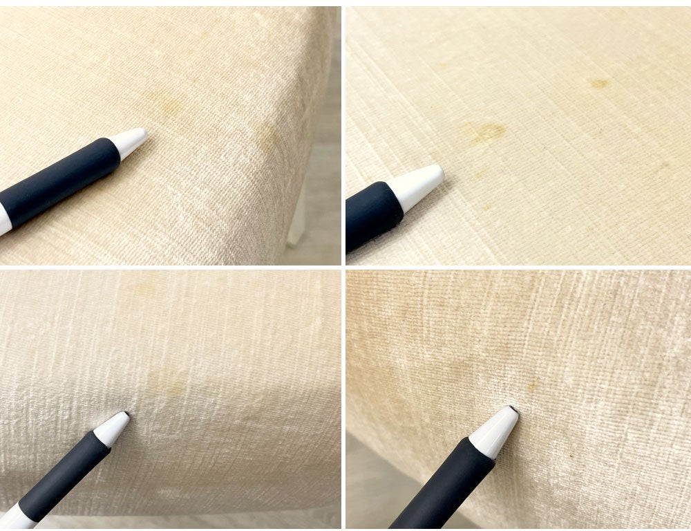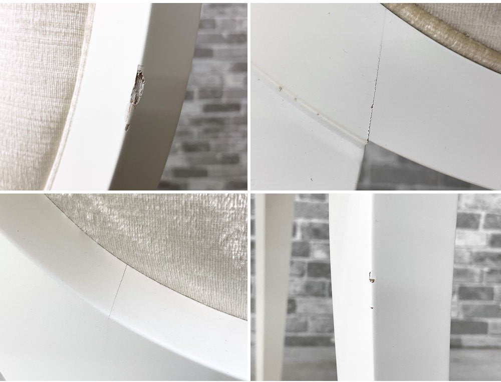 背もたれの角にやや目立つ打痕、脚部等にも細かな傷やそれに伴うペイントロスがあり、ファブリックにも薄い染みが複数見受けられます。