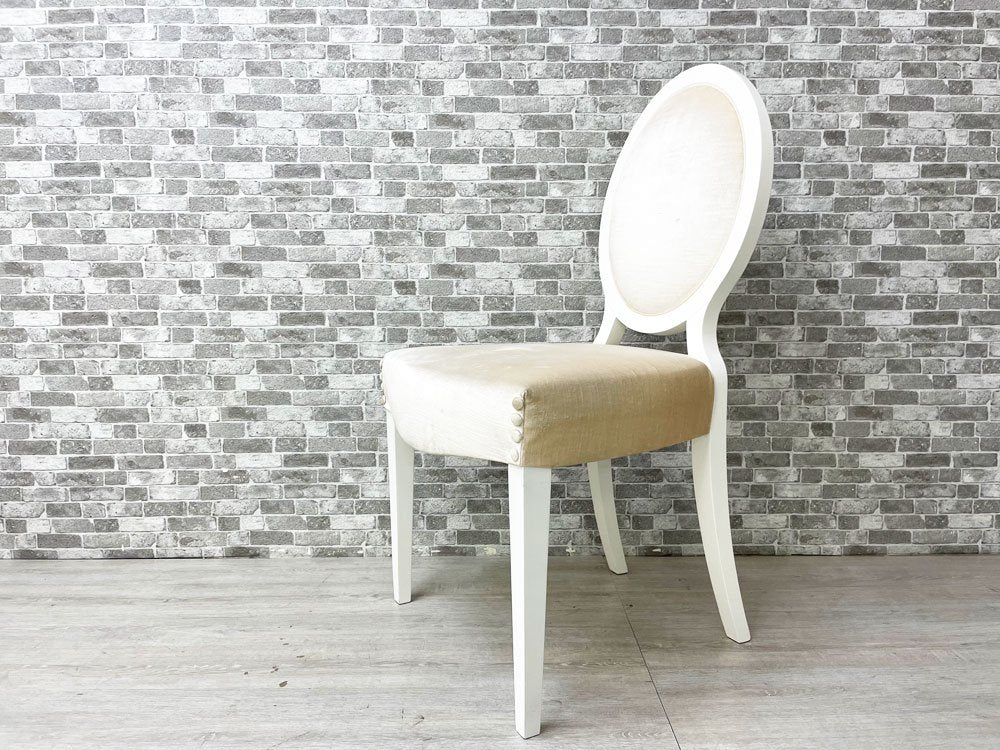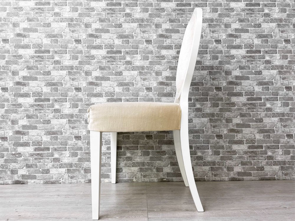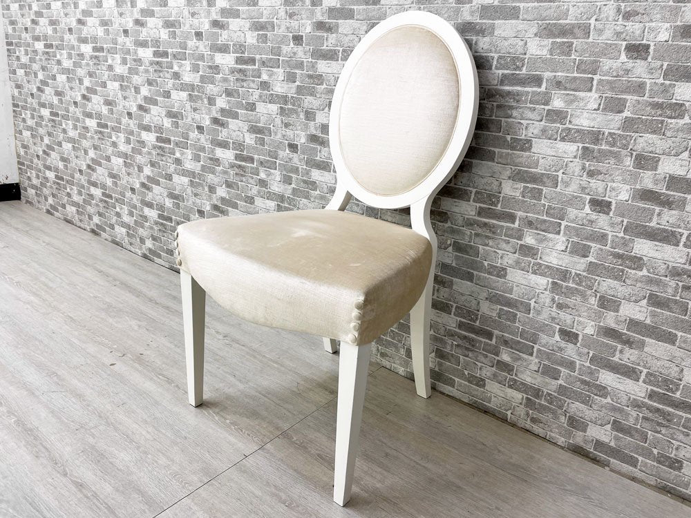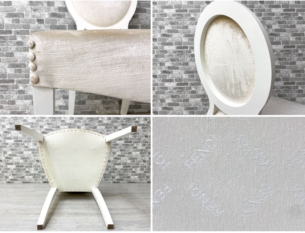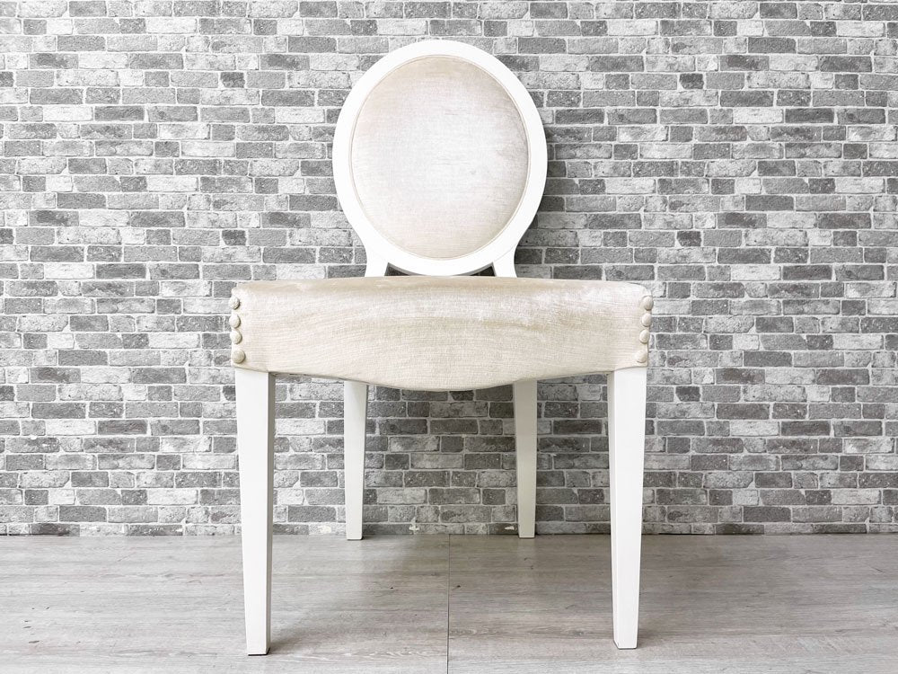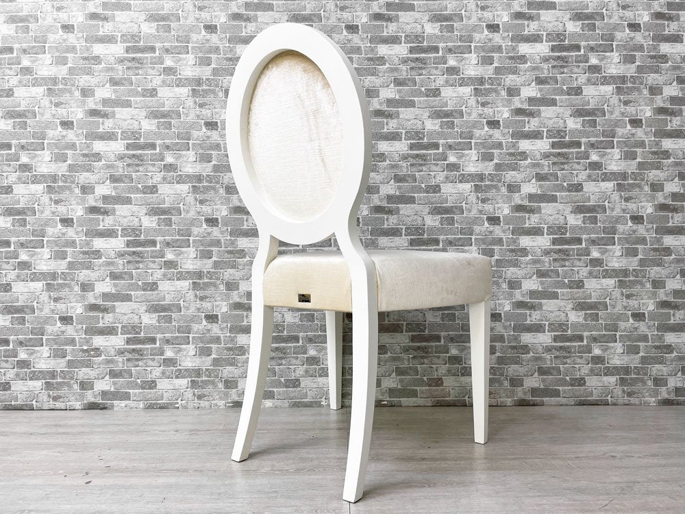 こちらの『 ガイア Gaia 』は、モダンとクラシカルを融合させ、曲線を基調にデザインされたダイニングチェアです。ホワイトペイントが施されたウッドフレームにベロア生地と思われる柔らかな肌触りのファブリックを組み合わせ、程よい弾力のクッションにより心地良い着座を実現。アームの無いスッキリとしたデザインは、圧迫感を与えずにレイアウト頂けます。